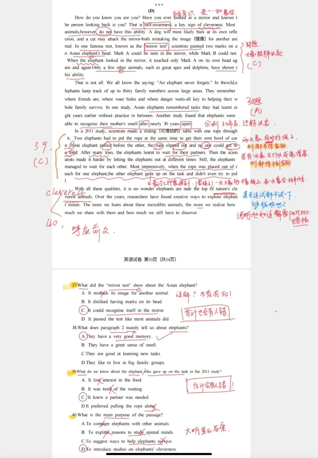 全卷最考验学术深度的一篇。讲大象的“镜子测试”和“拉绳实验”。