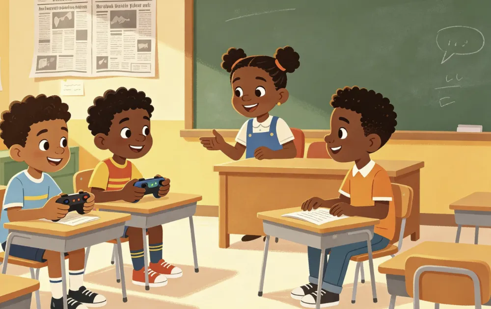 三个小朋友在教室讨论问题,两个男孩打游戏