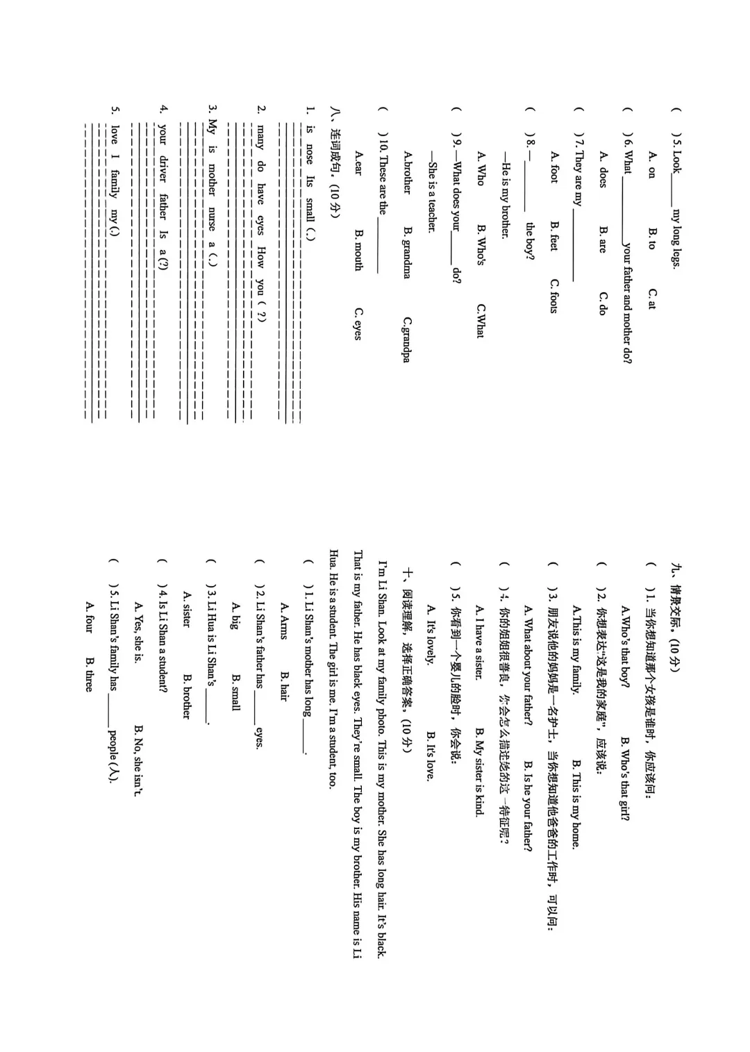 I'm Li Shan. Look at my family photo. This is my mother. She has long hair. It's black.That is my father. He has black eyes. They're small. The boy is my brother. His name is LiHua. He is a student The girl is me. I'm a student, too.