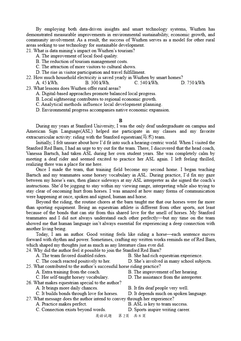 27. C 主旨大意题。设题点:对应全文作者通过经历传递的核心主旨。全文围绕作者用 ASL 沟通、人马互动等多元方式建立联结展开,最终升华主题。故选项C“联结超越语言”精准概括全文核心——作者用手语、人马互动等非口语方式,建立了与队友、与马、与世界的深层联结。