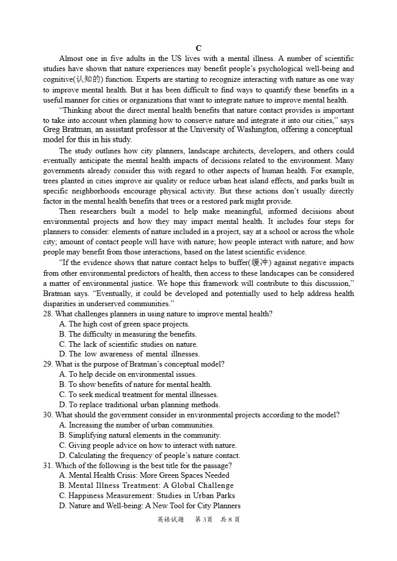 31.D 主旨大意题,考查标题概括。全文围绕“自然—心理健康—城市规划工具(模型)”展开,重点在于为城市规划提供新工具,因此D最贴切。A只强调问题(片面);B偏离主题;C聚焦“公园研究”过窄。