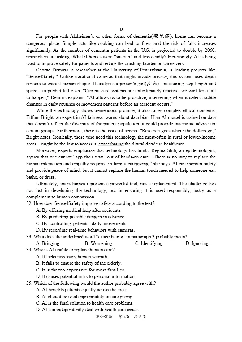 35. B 推理判断题。设题点对应文章最后一段的总结升华部分。最后一段指出:“Ultimately, smart homes represent a powerful tool, not a replacement. The challenge lies... in ensuring it is used responsibly, justly as a complement to human compassion.”(最终,智能家居是一个强大的工具,而不是替代品。挑战在于……确保它被负责任地、公正地用作人类同情心的补充。)这表明作者对AI持客观、理性的态度,认为它是一个有用的工具,应该被恰当、负责任地使用。因此,B项(AI应在照护中被恰当地使用)为正确答案。