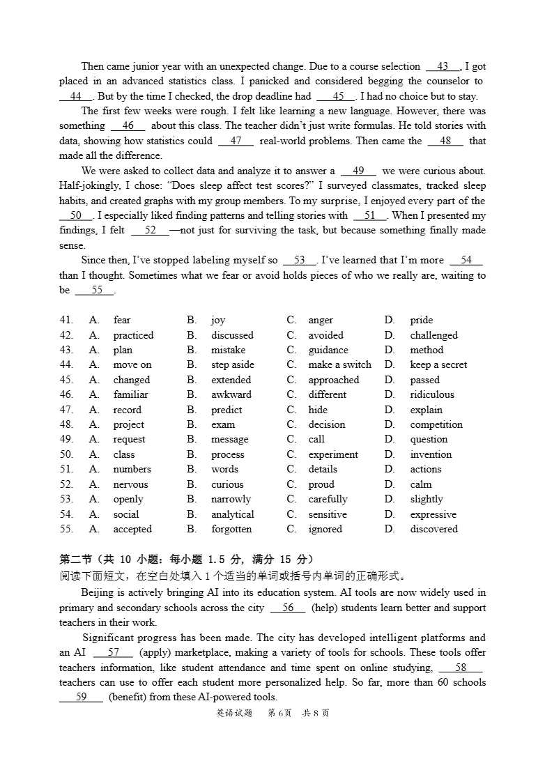 41. A考查名词辨析。根据下文“While others handled formulas with ease, I struggled a lot.”以及最后一段“Sometimes what we fear or avoid...”可知,作者过去对数学充满恐惧(fear)。joy(快乐)、anger(愤怒)、pride(骄傲)均不符合语境。