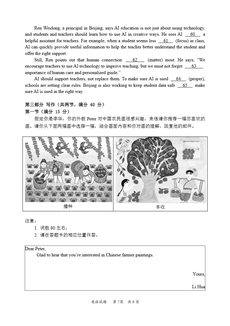 在中外文化交流日益密切的背景下,本题创设 “向外国友人推荐中国农民画” 的交际任务情境,要求学生以电子邮件的形式,从《播种》与《丰收》两幅农民画中选择一幅画(避免两幅都写),描述画面内容(What),阐释文化寓意(Why),表达推荐理由(So what),引导学生在真实语境中用英语传递中华优秀传统文化,体现对劳动精神与乡土美学的理解与认同,具有较强的文化意义和育人价值。