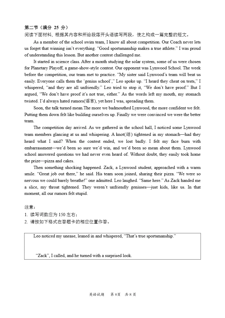 【语篇解读】本文是一篇叙事性记叙文,属于“人与社会”主题语境下的人际交往与品格塑造范畴。故事以第一人称讲述,围绕“体育精神”这一核心主题,叙述了“我”因赛前散布对手谣言而产生愧疚,最终在对手的宽容感染和队友的点醒下,主动道歉、实现自我成长的过程。原文通过细腻的心理描写与对比手法,呈现了人物从傲慢、嫉妒到羞愧、反思的转变。续写部分延续“体育精神”的线索,以Leo的点醒为转折点,触发主角内心的觉醒,进而通过向Zack的真诚道歉,自然推动情节走向和解与升华。续写不仅化解了主角内心的矛盾,也深化了“输赢之外,体育精神教会我们尊重与成长”的主题,在冲突与和解中体现了青少年道德认知与情感成熟的发展轨迹。