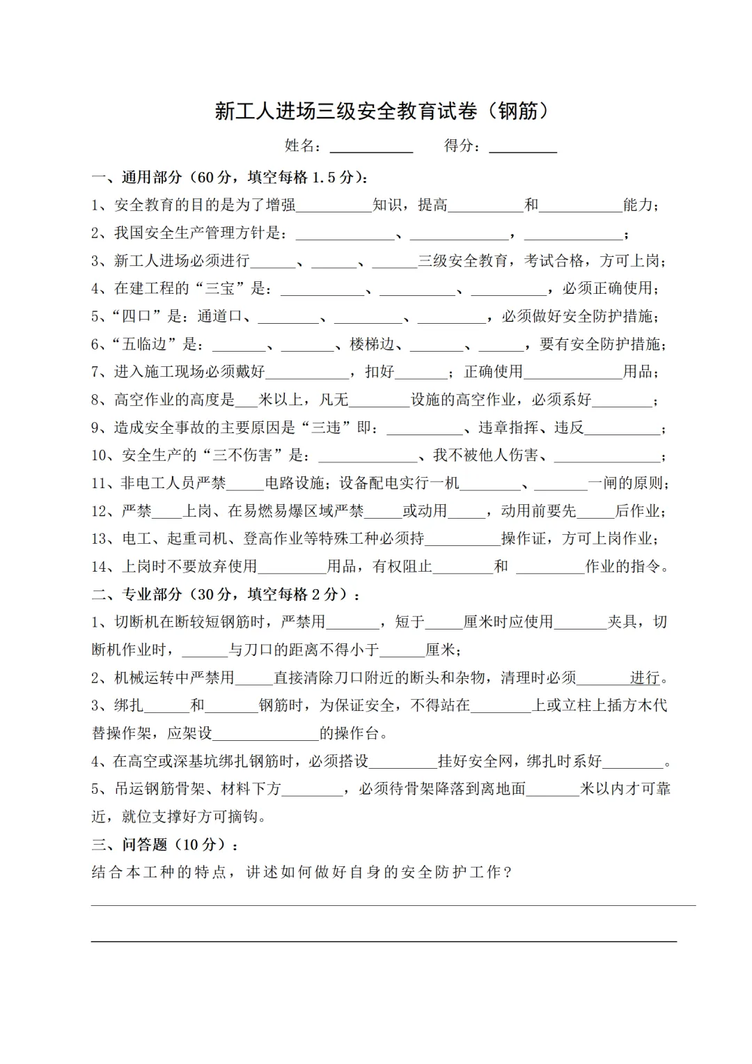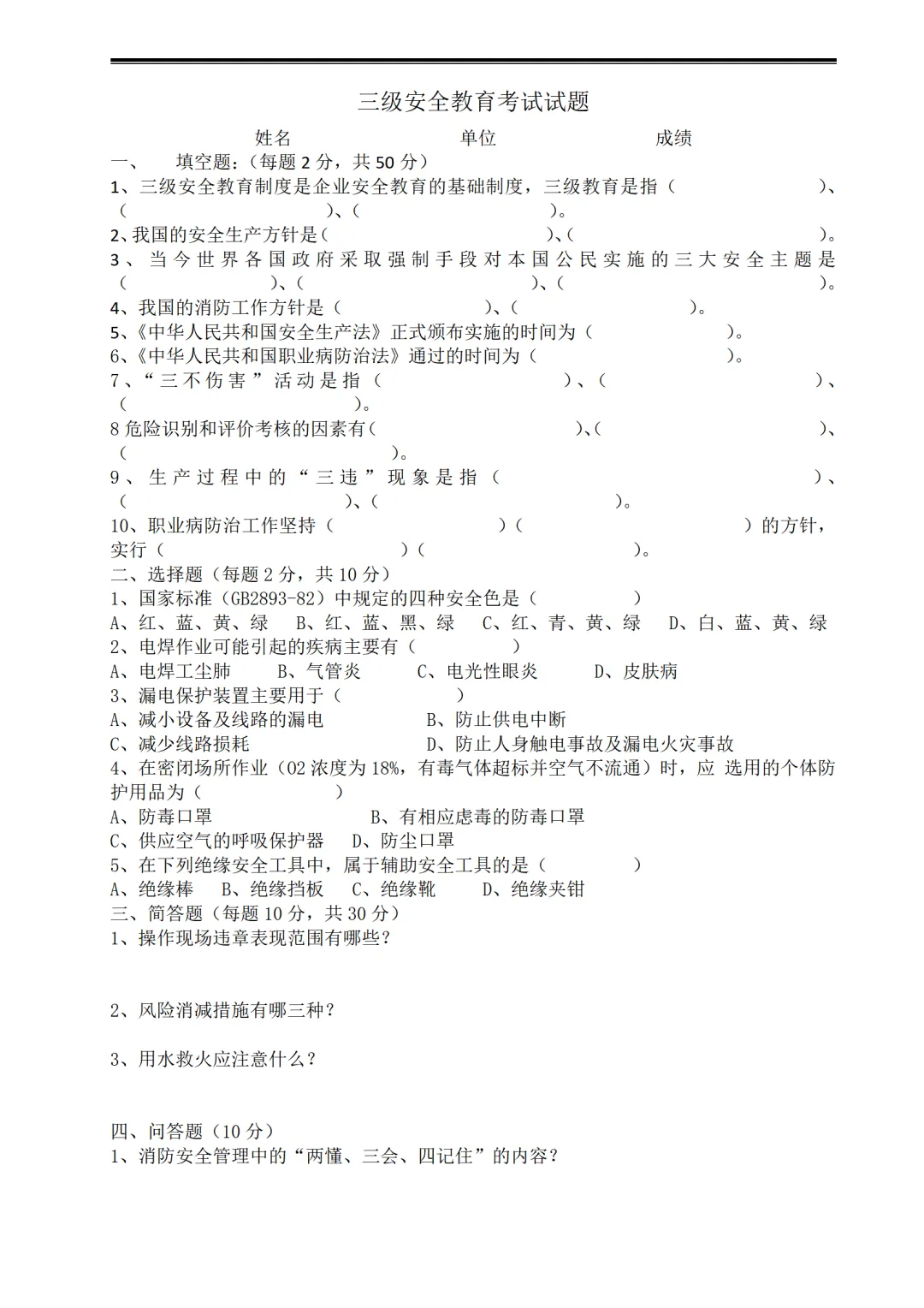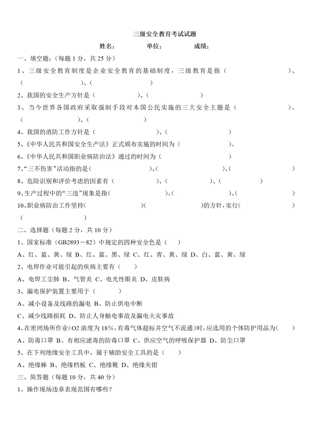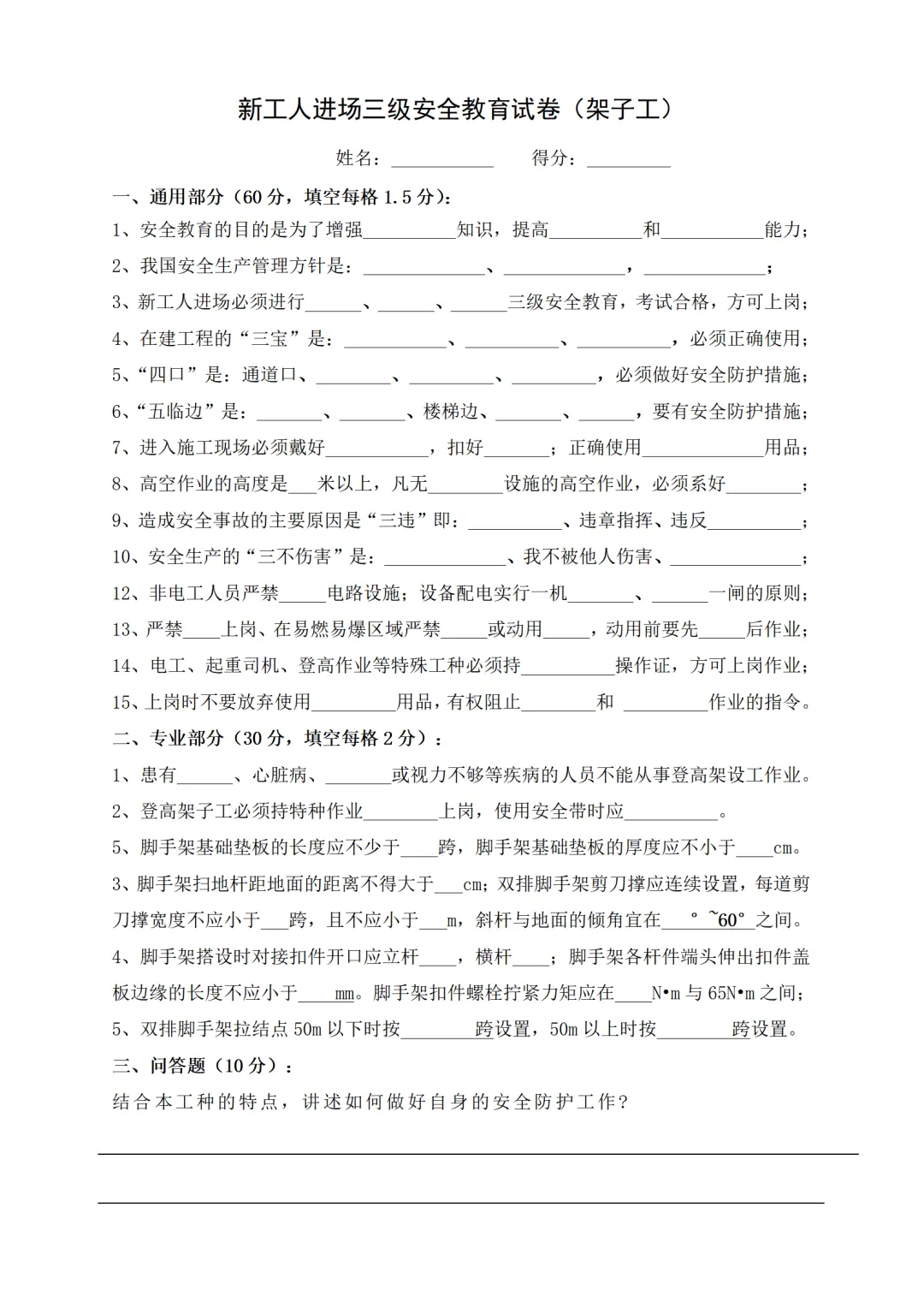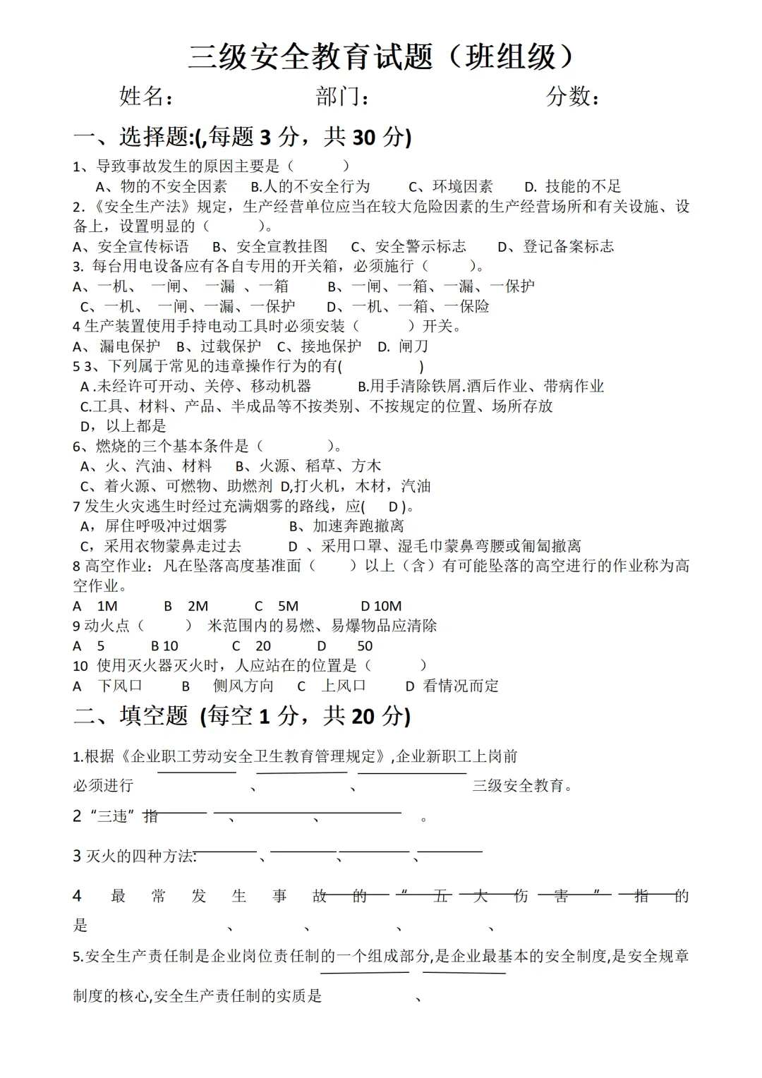 新员工三级安全教育试卷试题-参考版