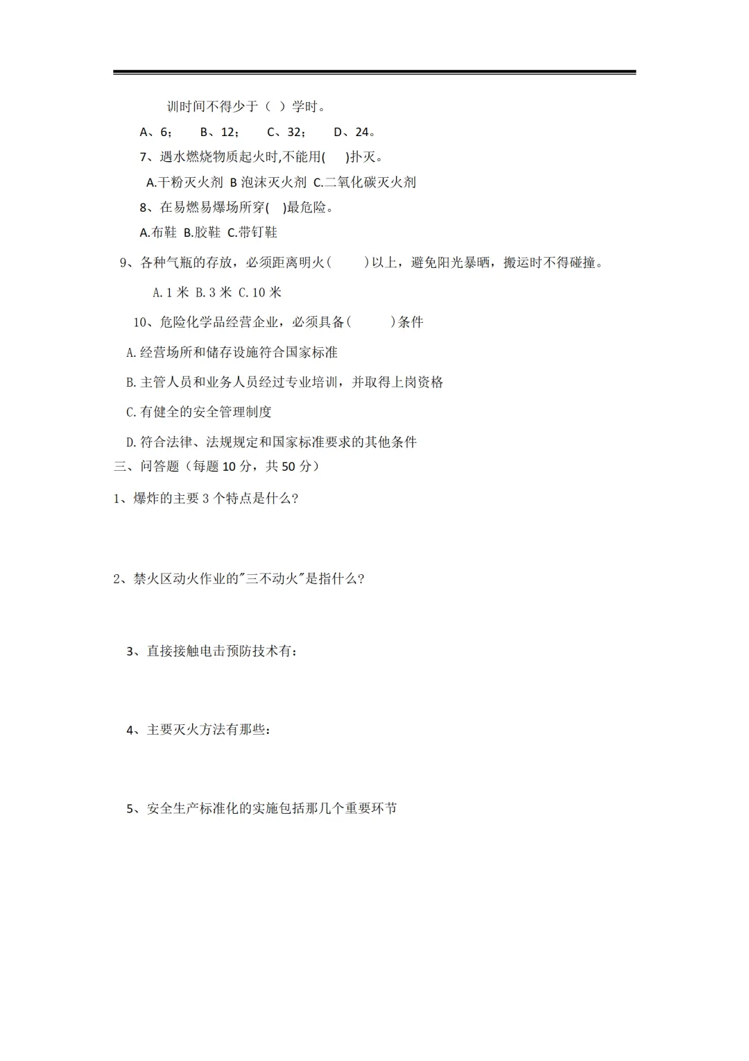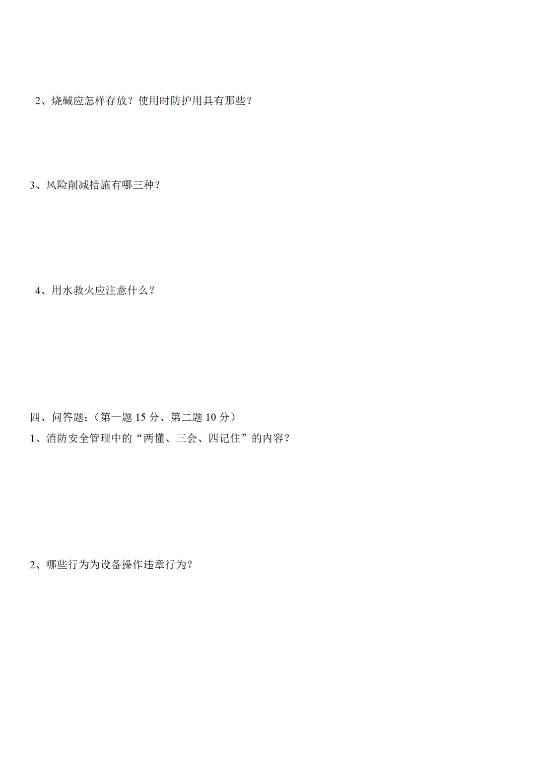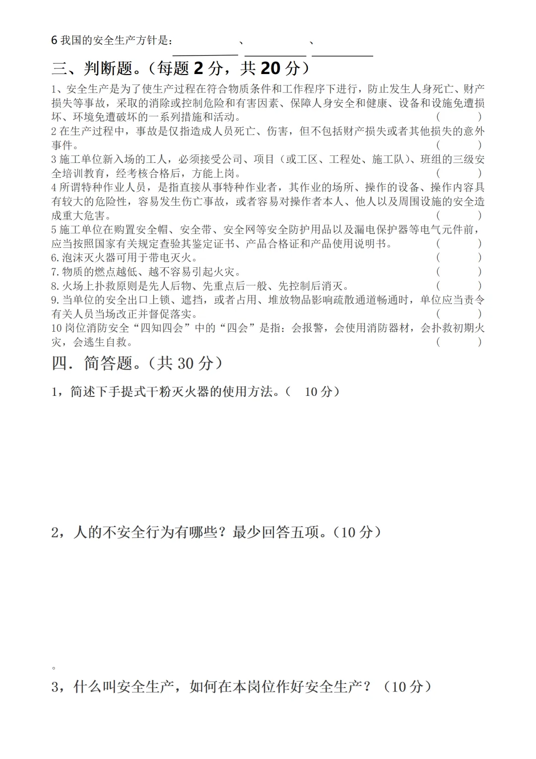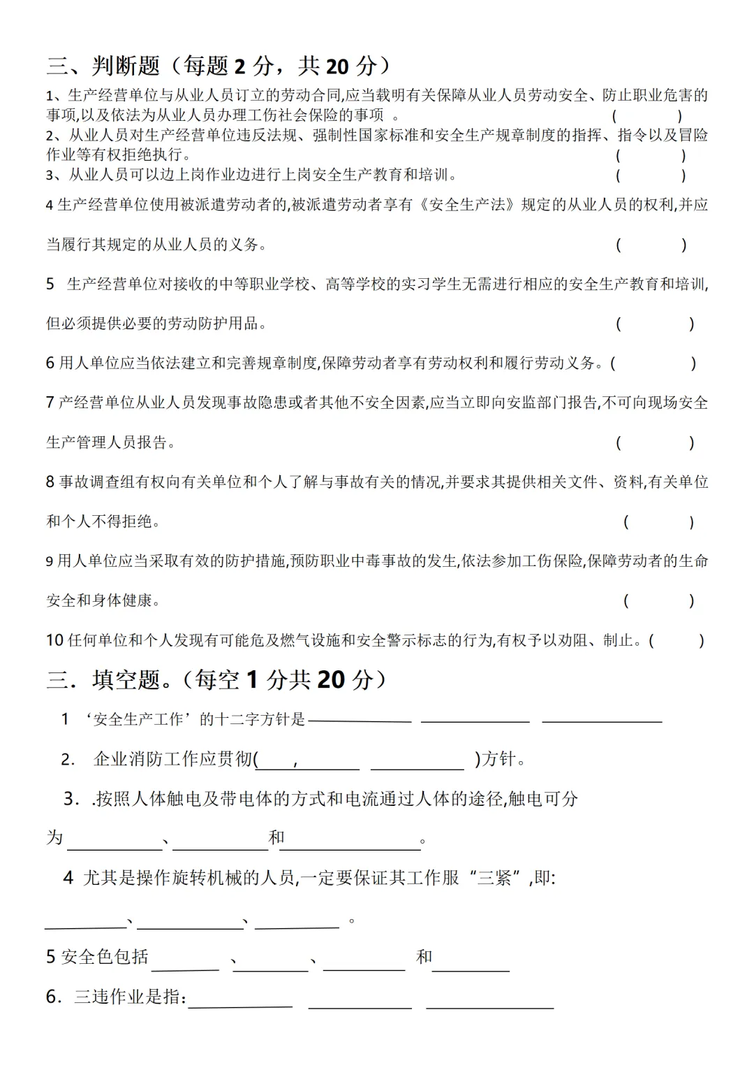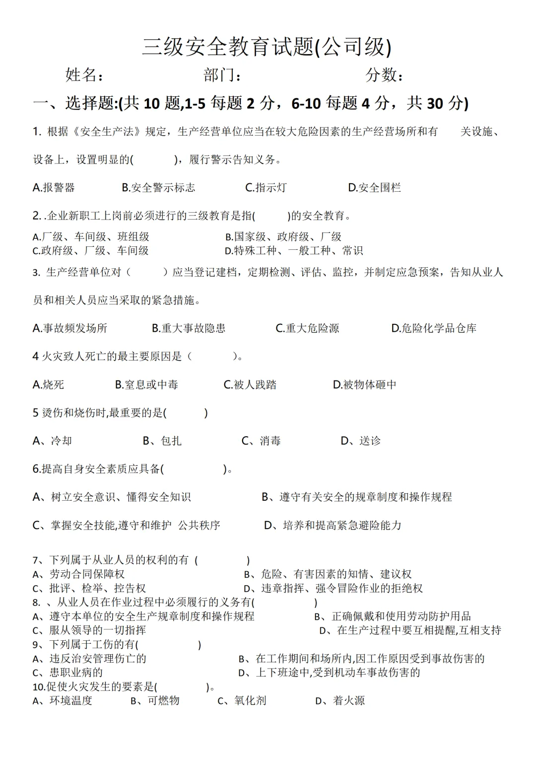 新员工三级安全教育试卷试题-参考版