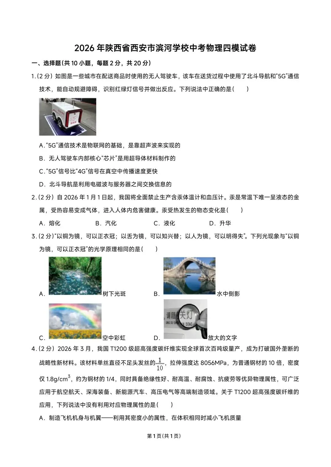 这套2026年铁一滨河学校中考物理四模试卷,严格贴合陕西中考物理命题趋势与新课标考点要求,整体难度梯度合理、情境新颖鲜活、题型覆盖全面,兼具基础巩固、能力区分与中考模拟实战价值,是一套高质量的考前冲刺模考卷。