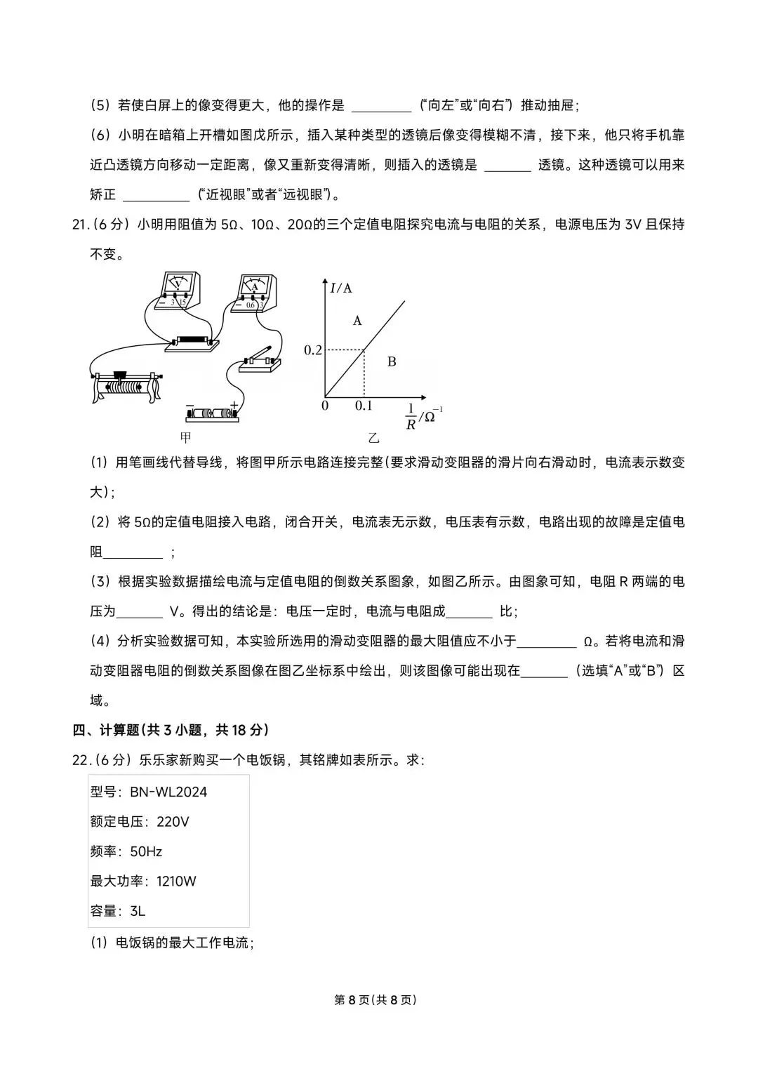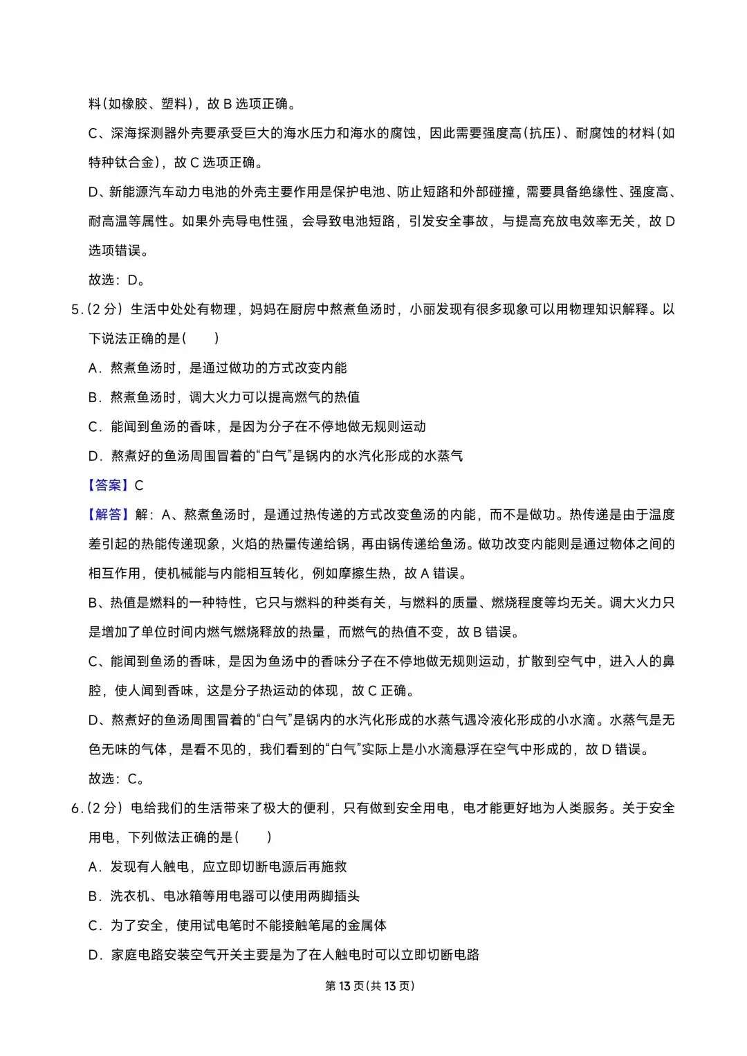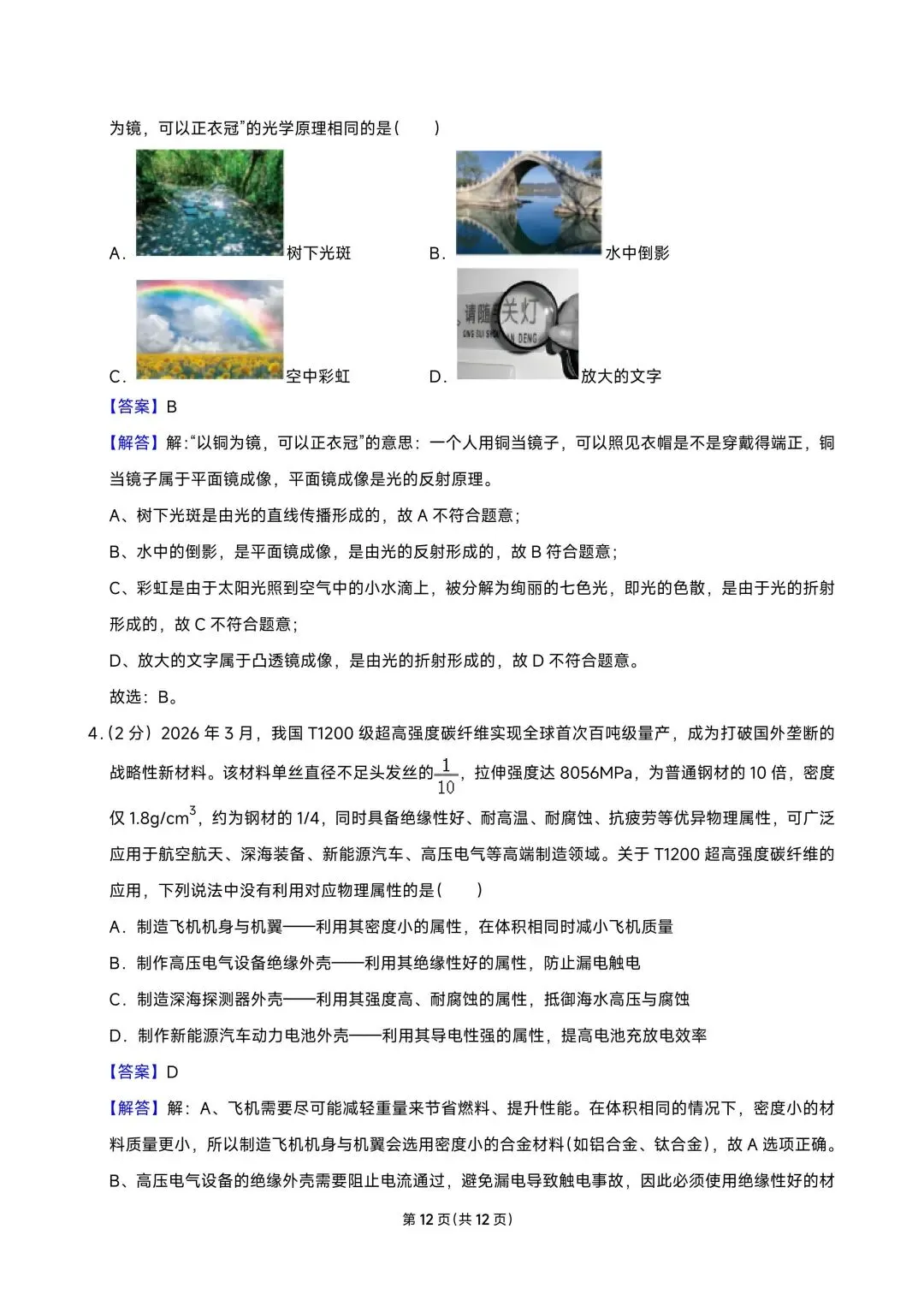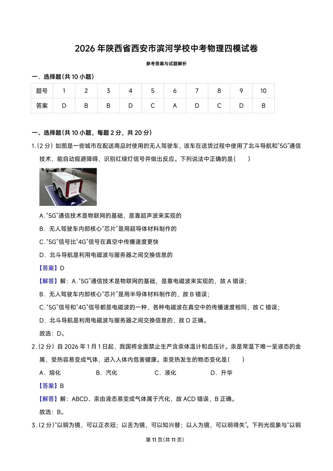 选择题前7题、填空作图题大部分内容,聚焦声、光、热、电磁、力学基础概念,比如电磁波与5G通信、物态变化、光现象辨析、安全用电、分子热运动等高频考点,全部来自课本主干知识,侧重考查学生日常知识积累与辨析能力,帮助学生排查基础漏洞。