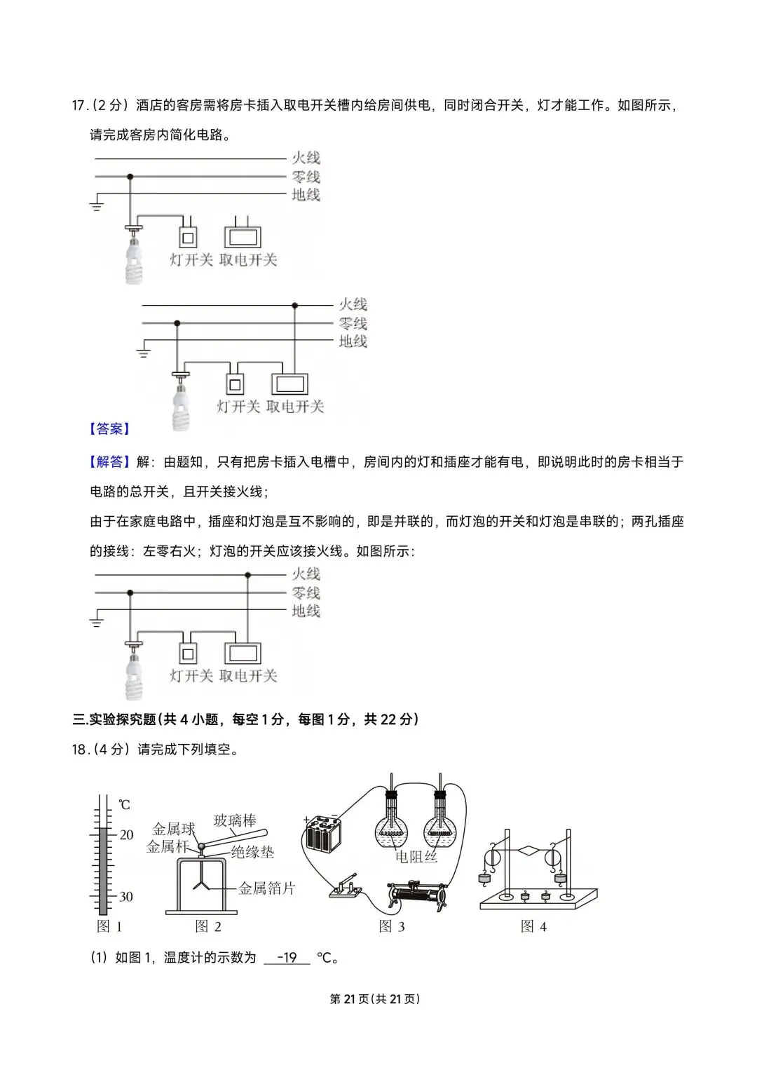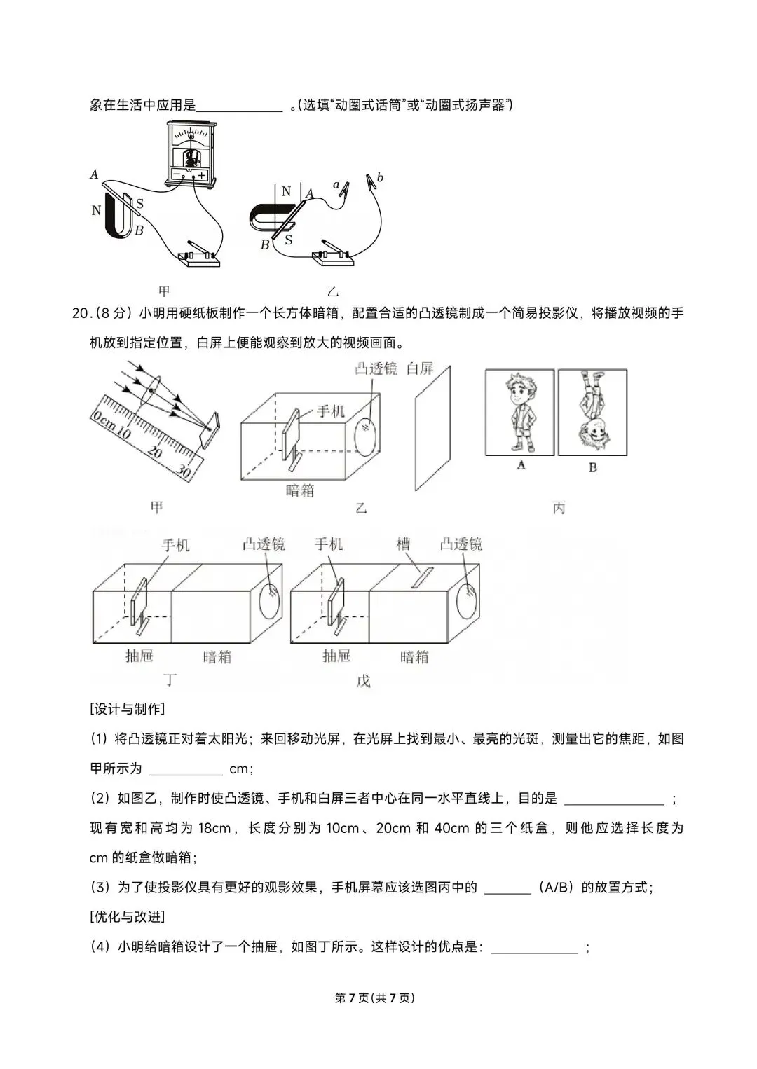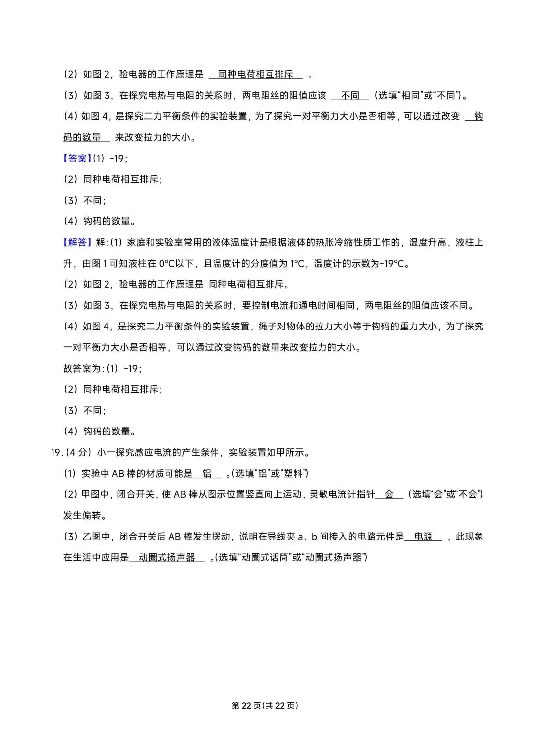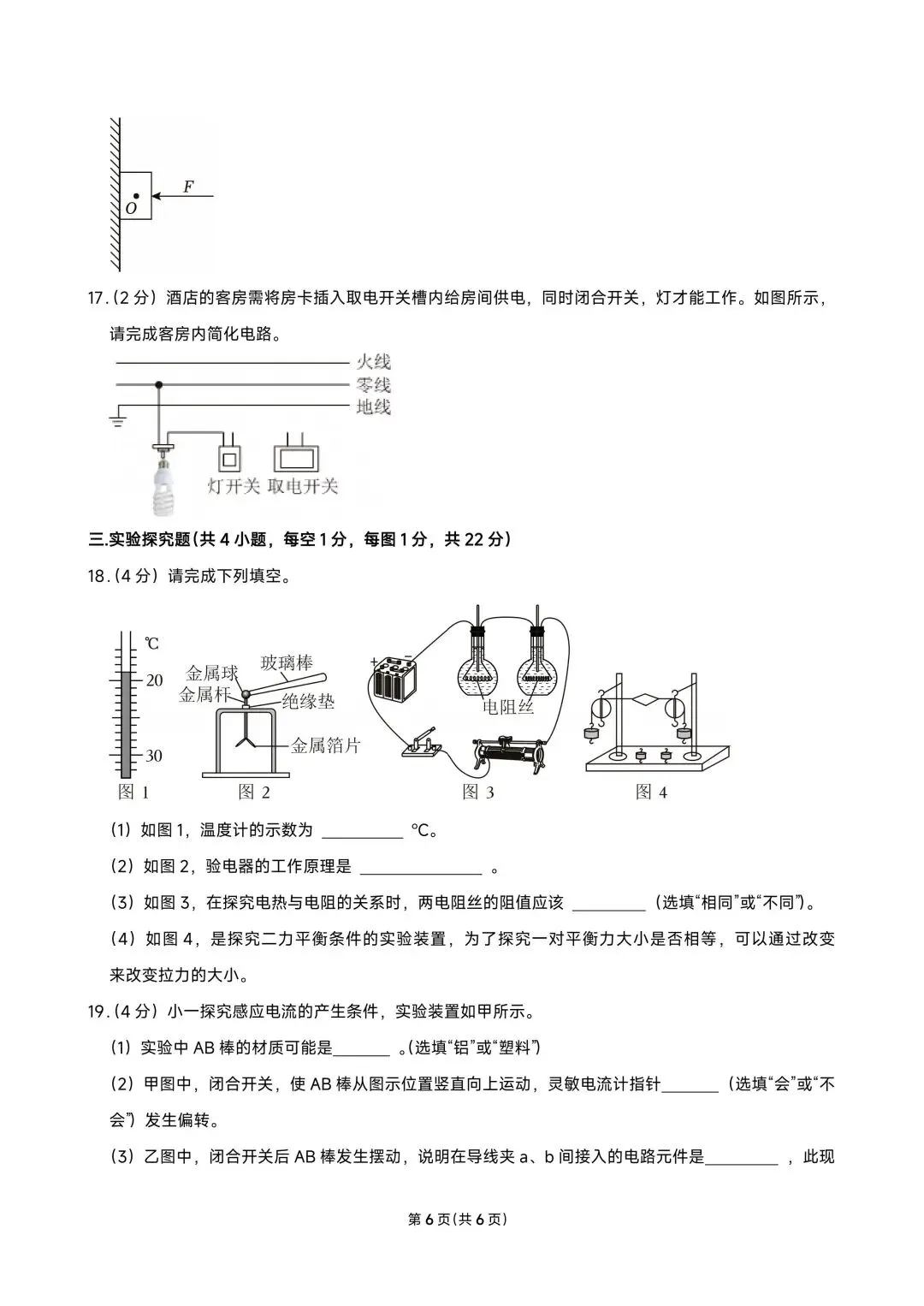 实验题板块覆盖温度计读数、验电器原理、焦耳定律、电磁感应、二力平衡、凸透镜成像、电流与电阻关系等中考必考实验,完整考查实验操作、现象分析、误差优化、器材改进全流程,精准对接物理学科核心素养中的科学探究与科学思维。