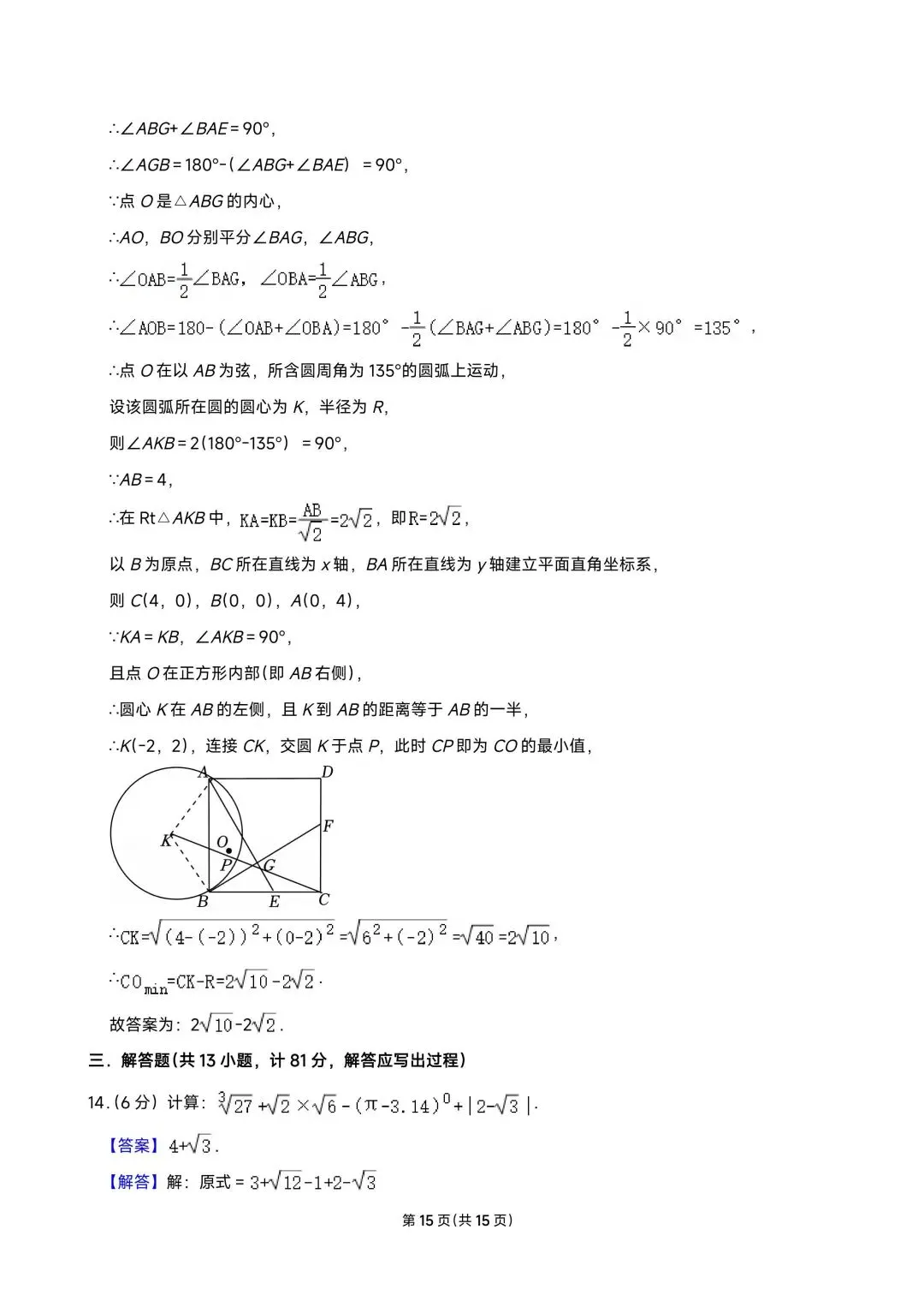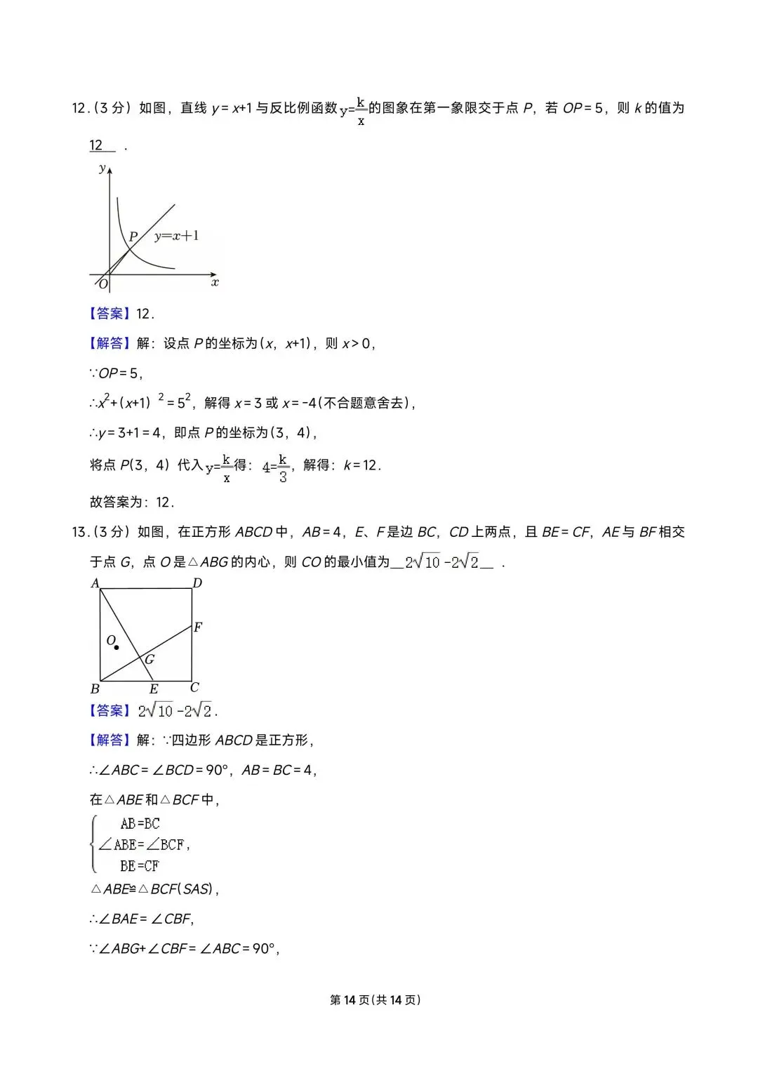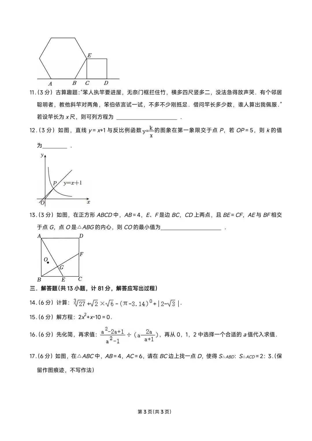 2. 中档拔高模块(选择6-7、填空13、几何综合):聚焦相似三角形判定、圆的弧长计算、正方形内心动点最值、一次函数面积问题,考查学生图形性质深挖、模型识别能力,是80-100分段学生的关键提分区。