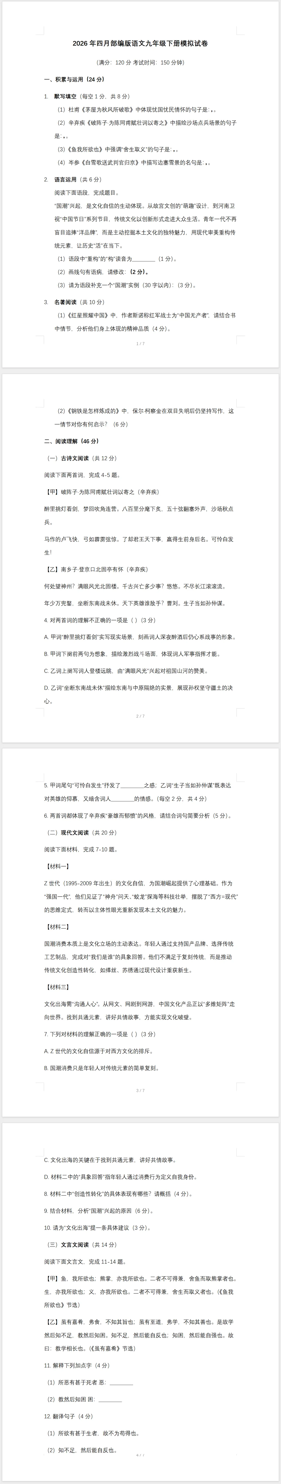 2026年四月部编版语文九年级下册模拟试卷(含答案)
