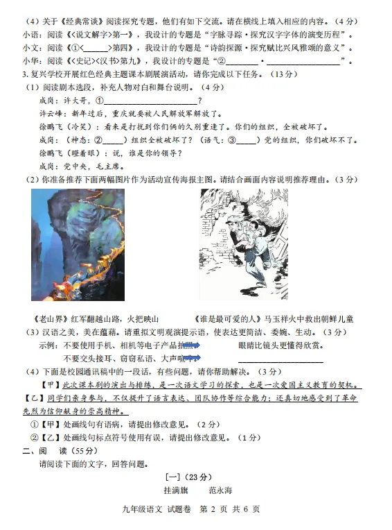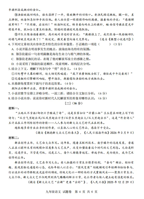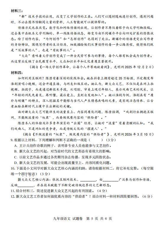 九年级语文参考答案及评分标准