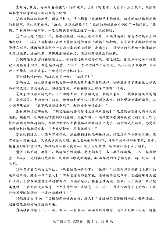 一波三折:小说在情节安排上设置三次波折,抢修旗杆,遇暴雨,任务受阻,是一折;旗杆基座钢板受损,使得抢修困难加大,是二折;挂满旗时,发现渔民遇险,既要救援,又要升旗,是三折,(2分)使小说情节更有悬念、戏剧性。(1分)(共6分。意思对即可。)