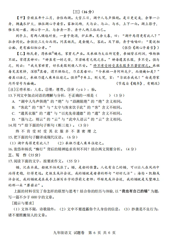 16.张岱于寒冬雪夜独自一人去湖心亭赏雪,可见他超凡脱俗的精神追求;张岱痴迷洁白晶莹的雪景,可见他高洁的精神追求。(答对其中一点即得2分)