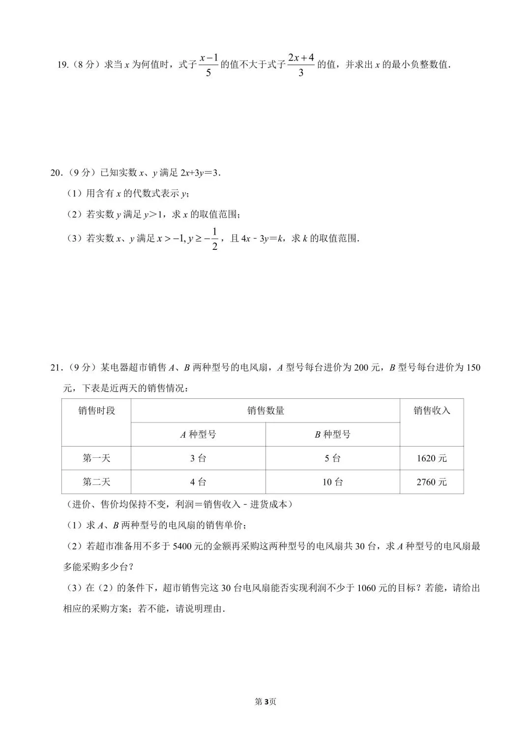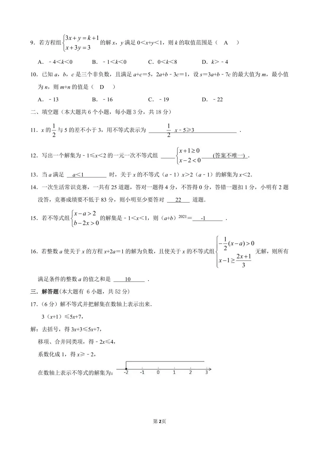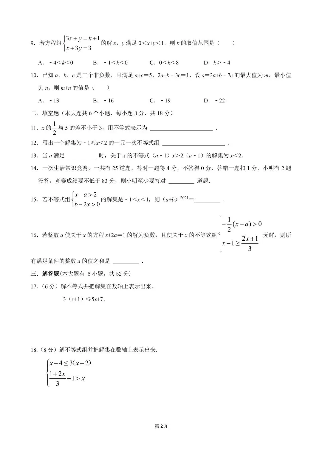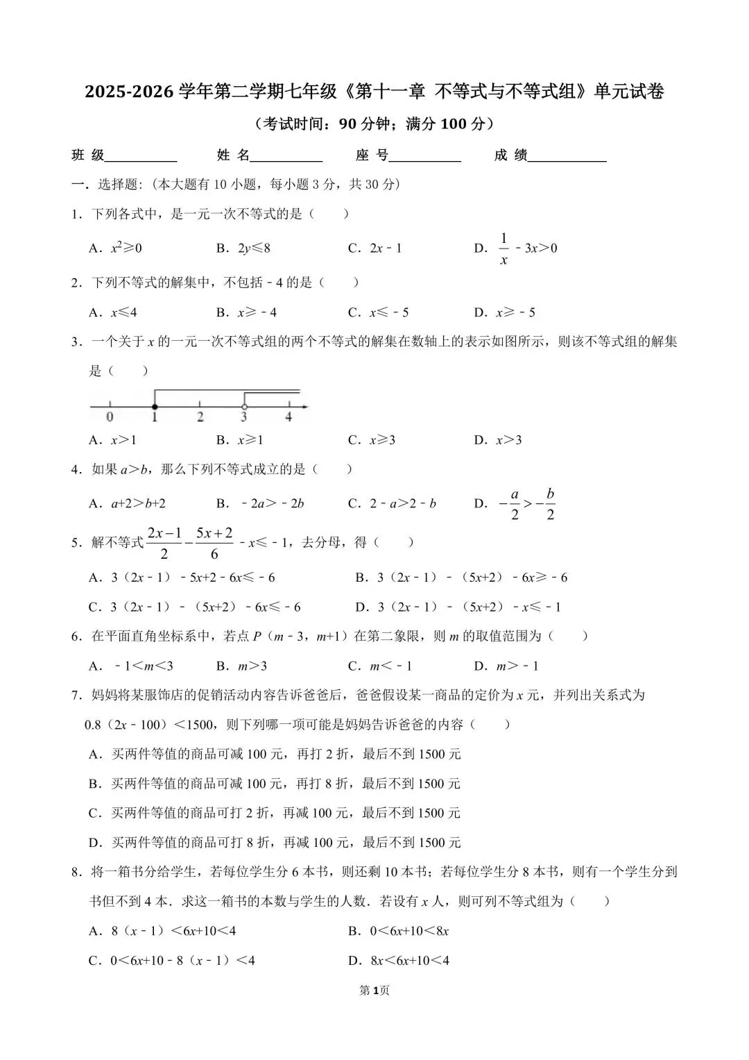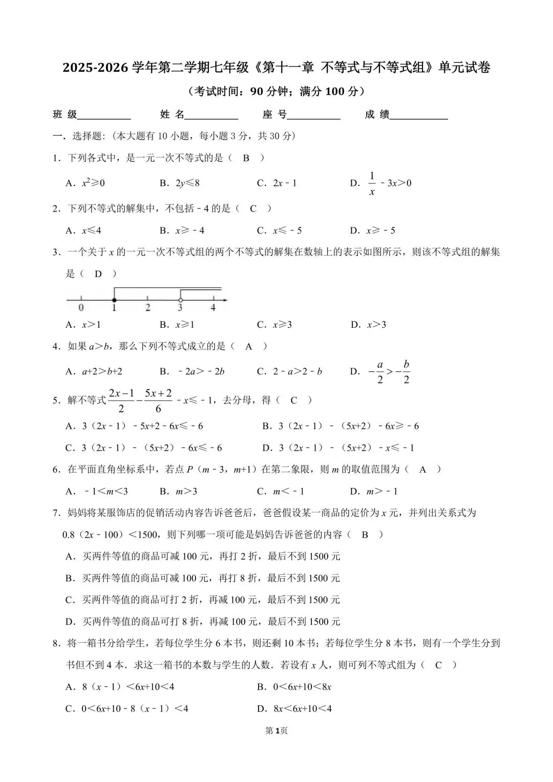 新人教版,2025-2026学年第二学期七年级第十一章《不等式与不等式组》单元试卷