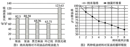 (2)由图1可知纳米海绵对(填油品名称)的吸收能力最强。