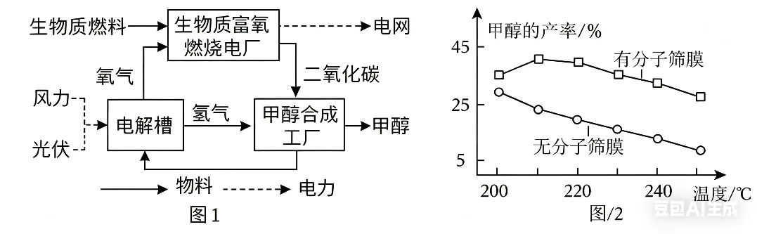 43.(4分)我国研究团队提出基于绿氢和生物质富氧燃烧技术“零碳甲醇(CH3OH)合成系统”,基本组成如图1。甲醇可通过二氧化碳加氢合成,合成过程中其产率随温度变化的关系如图2。甲醇完全燃烧生成二氧化碳和水。