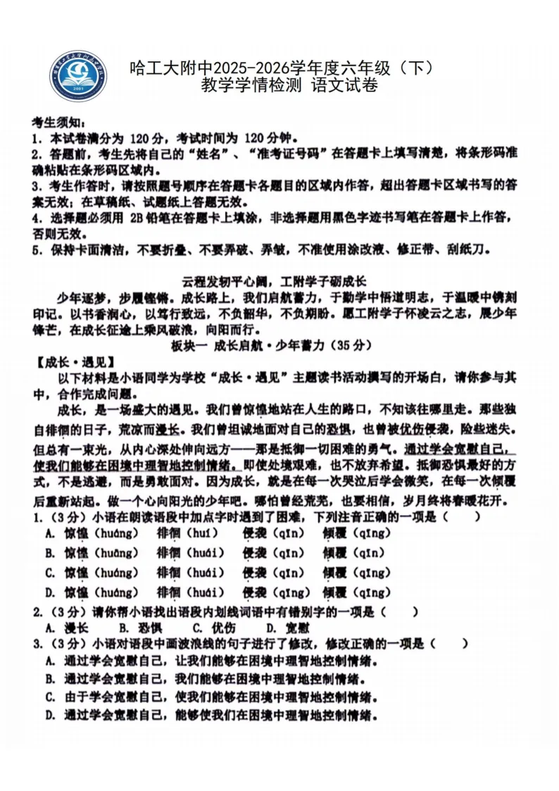 >2026工附中学六年级下语文期中考试 试卷+答案