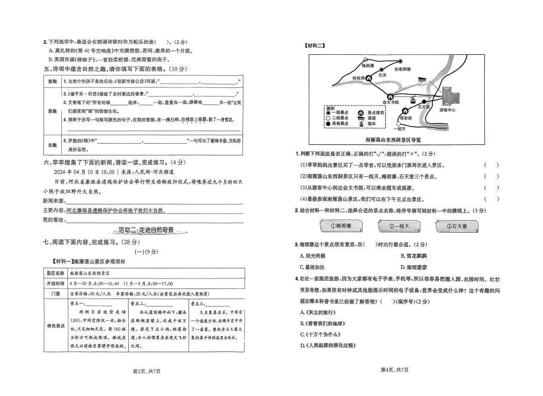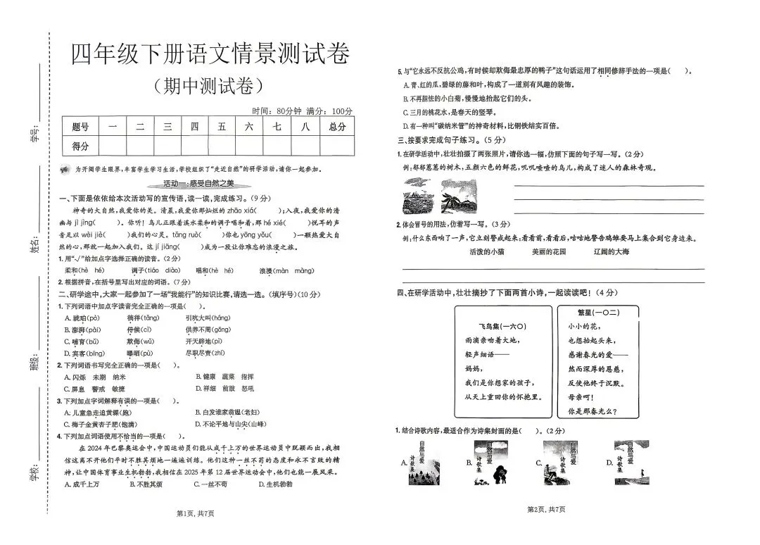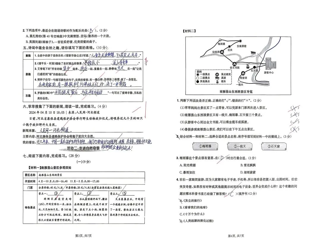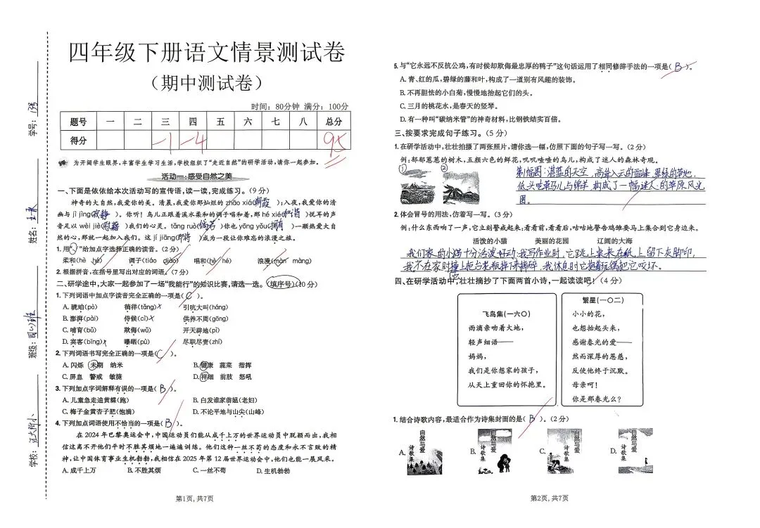本周三,我们进行了一次以 “走进自然” 为主题的期中语文情景测试。不同于传统的字词、课文专项卷,这份试卷把整份练习都放进了一场研学活动里,从 “感受自然之美” 到 “走进自然奇景”,再到 “书写心中之美”,所有题目都围绕真实场景展开,更贴近当下语文考试的趋势 ——重运用、重理解、重生活联结,不再是单一的背写考查。今天就和读者们一起复盘这份试卷,聊聊孩子的优势与可以发力的方向。