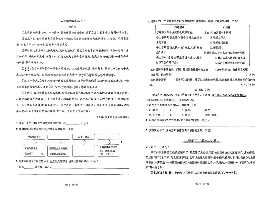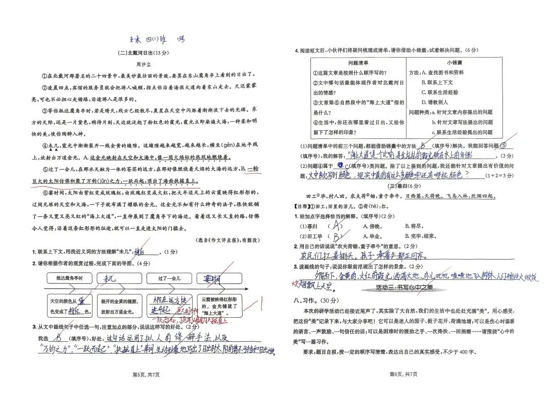 这部分以 “南雁荡山景区导览” 为材料,考查孩子从地图、表格里提取信息、判断正误的能力,非常贴近生活。这类题目没有复杂的理解难度,只要孩子能耐心读材料、找对应信息,就能做对。但也有部分孩子因为粗心,看错了地图里的景点标注,导致失分。2. 《北戴河日出》阅读:和课本联动,重在 “赏析与提问”