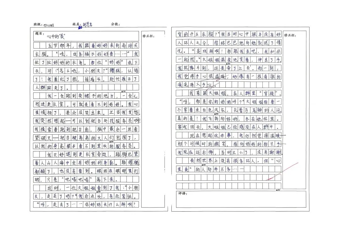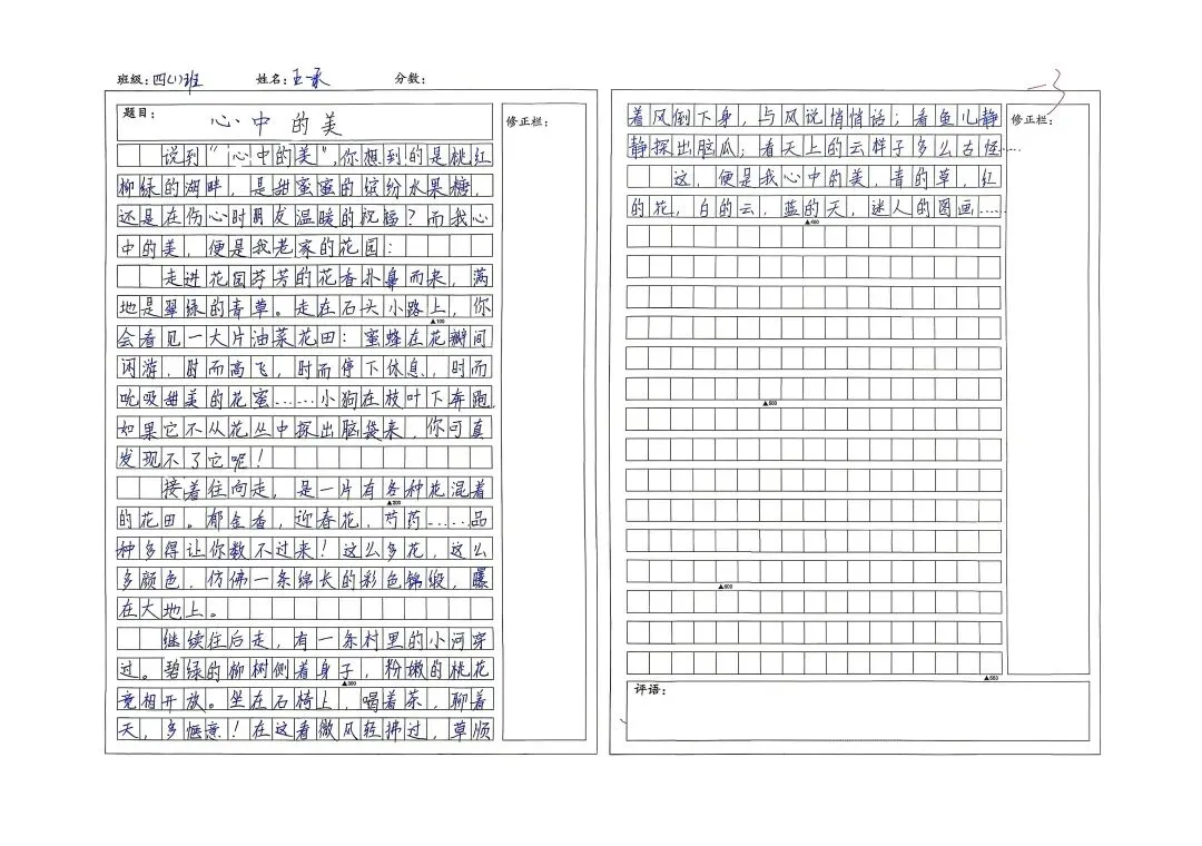 这次的作文题《心中的美》,给了孩子很大的发挥空间:可以写美景,比如迷人的园子、荷塘月色;可以写美言,比如伤心时的一句鼓励;也可以写美德,比如困难时的一次帮助。很多孩子拿到题目,第一反应是 “什么都想写”:既写了老家的花园,又写了同学的帮助,还写了路上看到的风景,结果面面俱到,却什么都没写透。而那些发挥得好的孩子,都做到了 “聚焦”:只写一个场景,比如老家花园的四季,把油菜花、小河、柳树写得具体生动,字里行间都是真情实感。其实,“美” 的作文,我们平时练过很多次:语文园地的《我的乐园》,我们带孩子写过小河边的草地、江苏大学的梅园;上学期我们实地探访过体育馆旁的小湖,专门练过景物描写。这些练习,都是为了让孩子学会 “把一个点写细、写活”。生活里从不缺少 “美”,缺少的是孩子发现美、聚焦美的眼睛。有的孩子更会选材,把美聚焦到人物身上,写出了好几篇优秀习作。这里篇幅有限,分享一篇满分的考场习作。