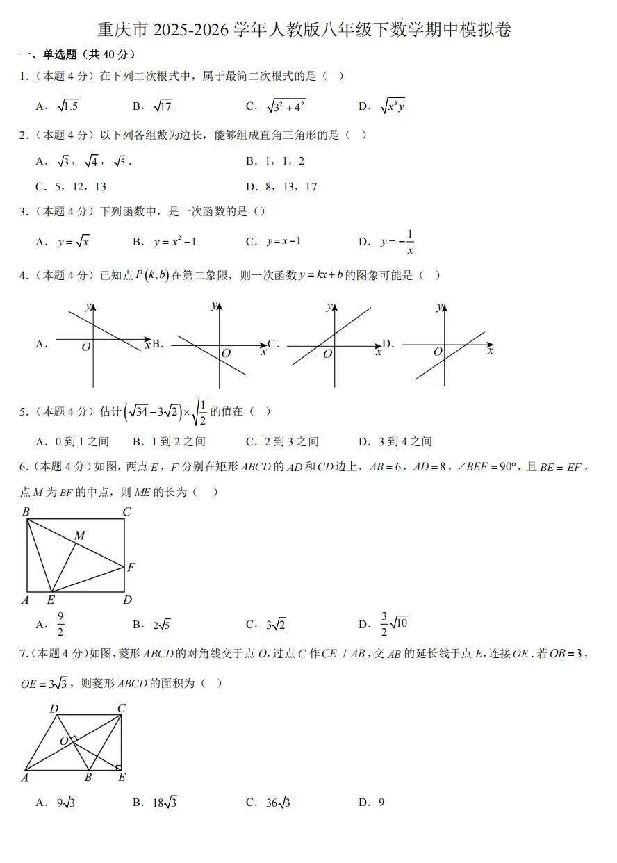 重庆市2025-2026学年人教版八年级下数学期中模拟卷.pdf