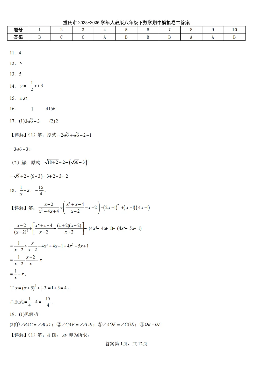 重庆市2025-2026学年人教版八年级下数学期中模拟卷二【答案】.pdf