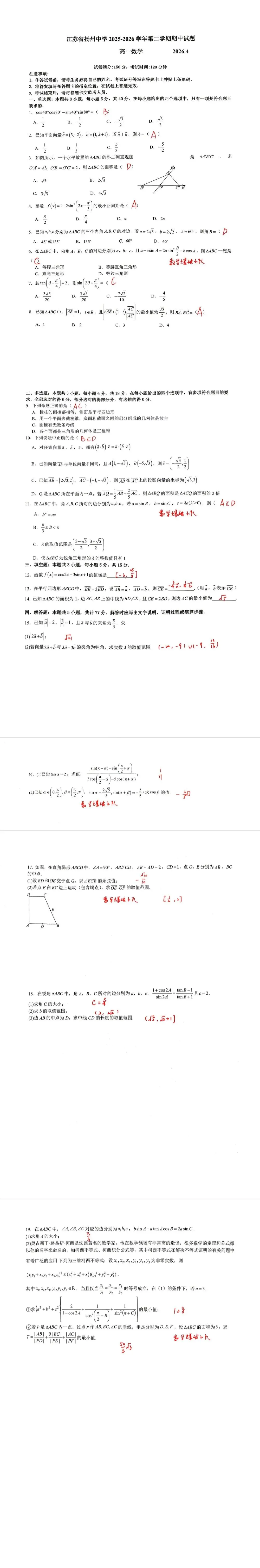 >26年江苏省扬州中学高一下学期数学期中试卷