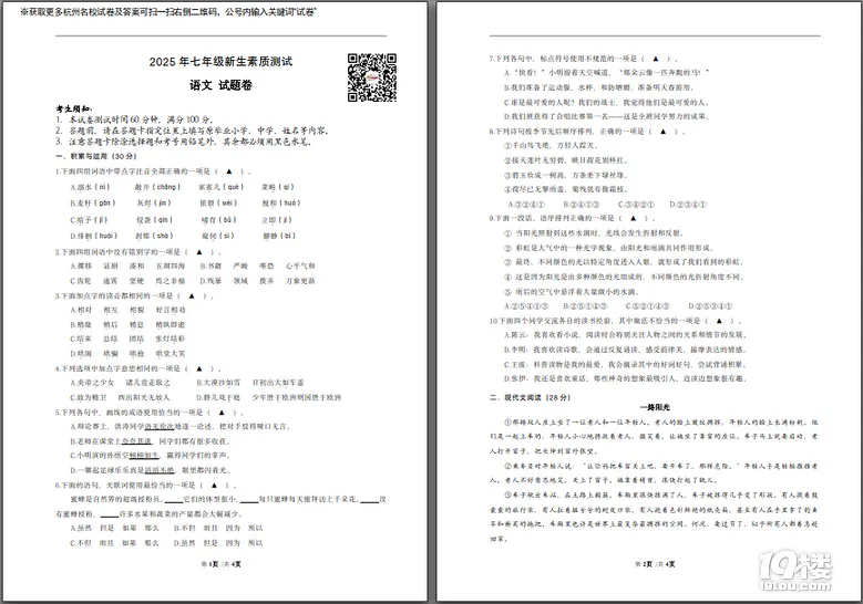 今天为大家准备的是家长上传的2025学年拱墅区新生素质测试语文试卷,获取试卷完整电子版pdf免费下载及参考答案分析请点击文中的小程序!