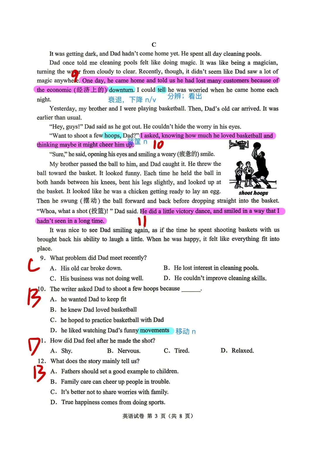 13题概括②段段意。14题猜词,大家要注意英语文章中破折号的解释说明作用。15细节题。16最佳标题。