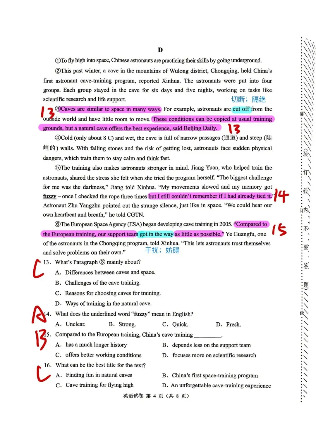 对于初二基础较好的学生而言,也完全可以练习这套一模卷子,材料逐词翻译,提炼从句,把握阅读方向,继续保持时文的训练!