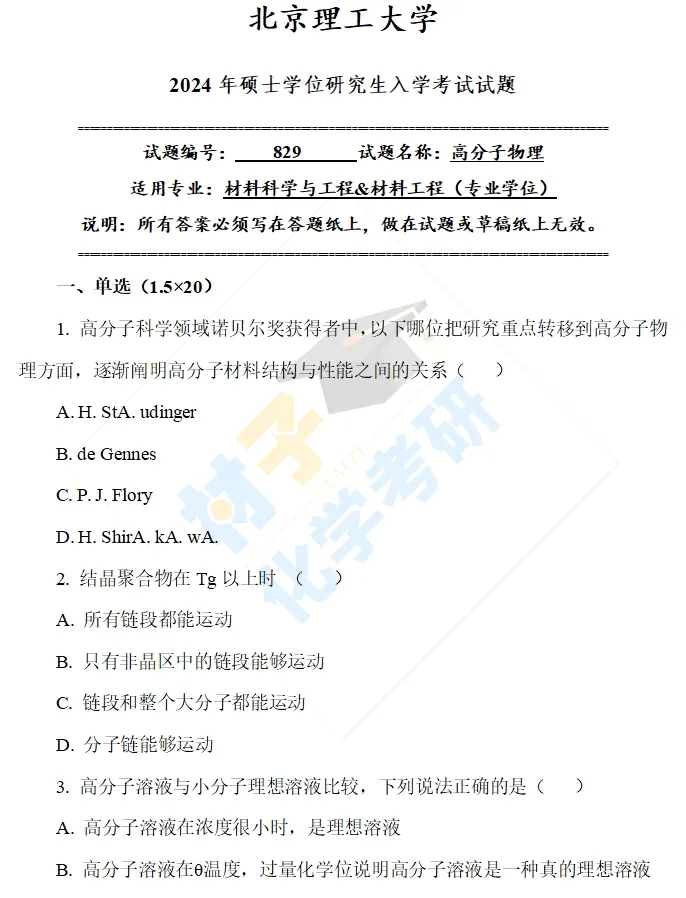 【考研真题】2024年北京理工大学(829高分子物理)真题公布