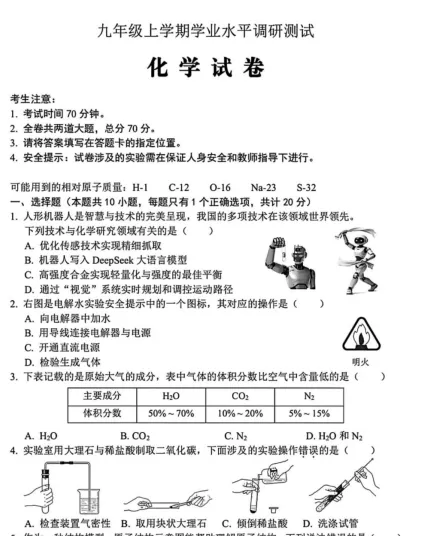 以下是小编搜集整理的测试题目,学生朋友可以直接下载打印,如果您有时间可以做一做。如果家里没有打印机或打印不方便,可以扫文章末尾的二维码,找王老师帮您打印,鹤城区自己来取。九年级上学期学业水平调研测试化学试卷