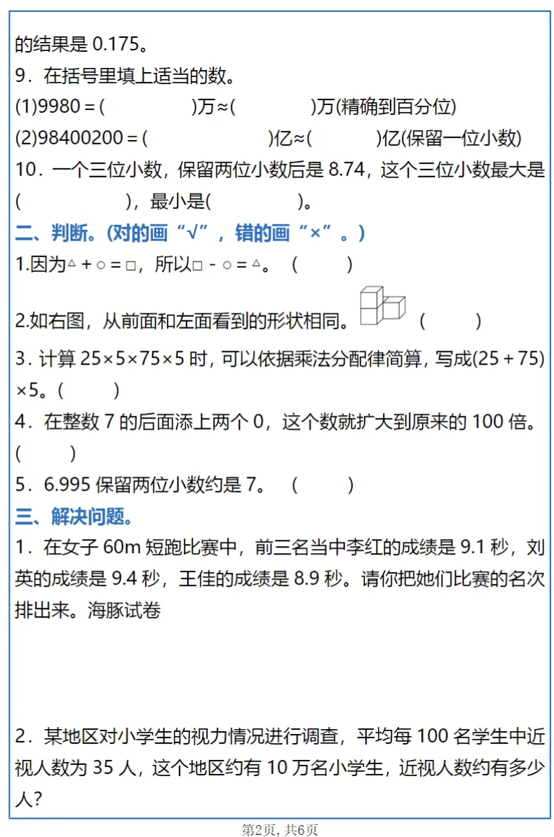 26年春人教版数学计算题专项训练·每日一练 (含口算、列竖式计算、思维训练题等)1-6年级下册,电子版可下载打印