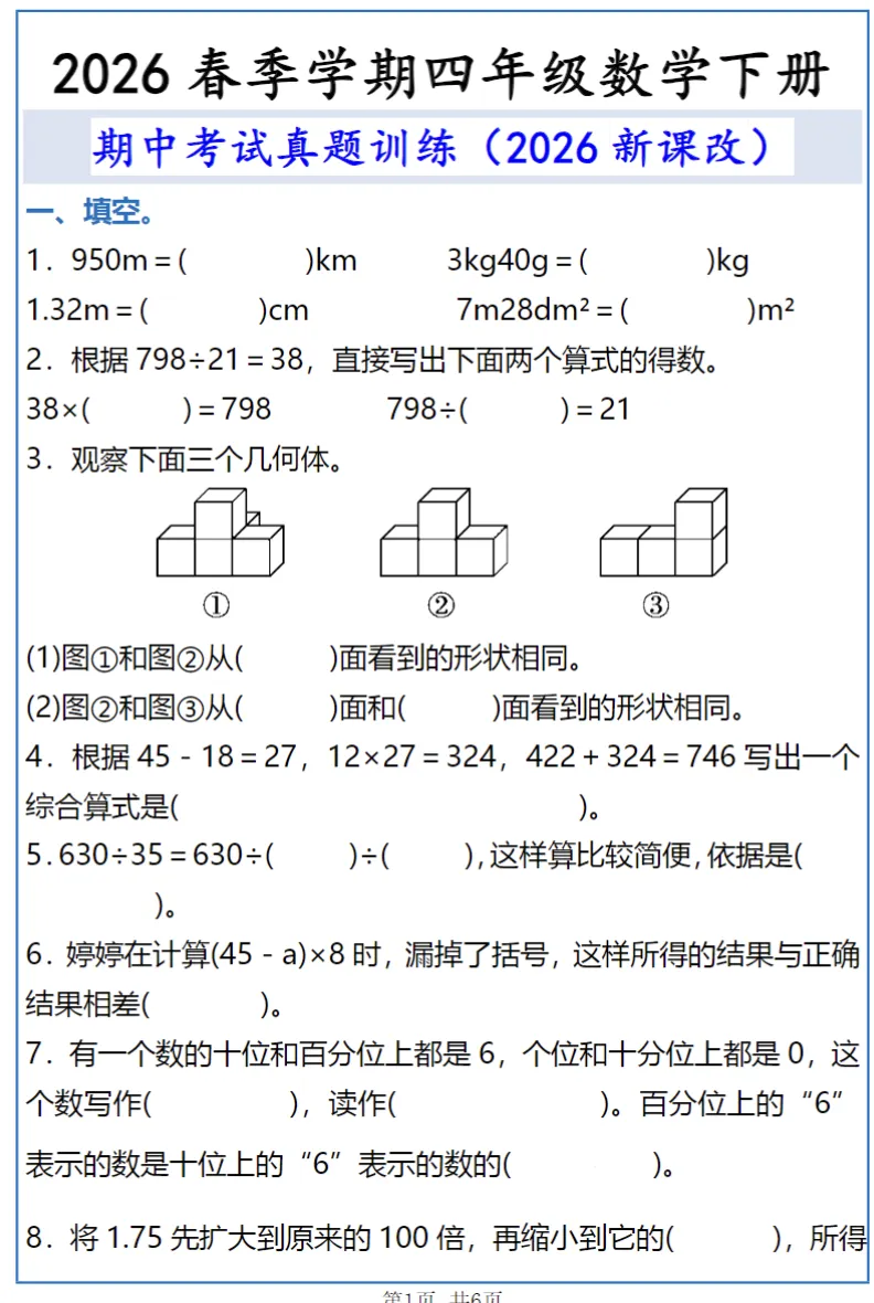 2026春四年级下册数学《期中考试真题训练》高清电子版可打印需要的家长可以收藏打印给孩子练起来吧!
