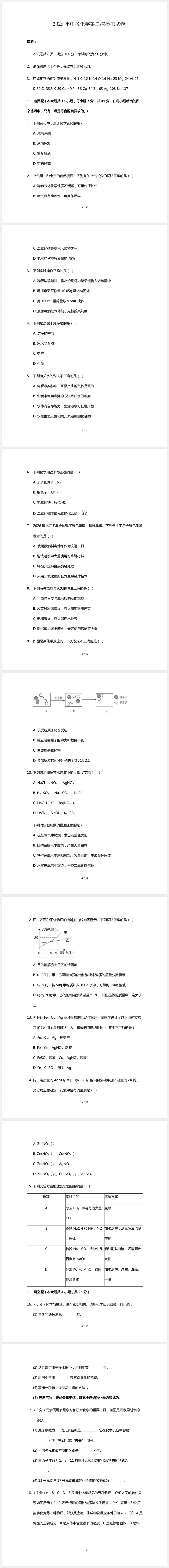>2026年中考化学第二次模拟试卷(四月)含答案