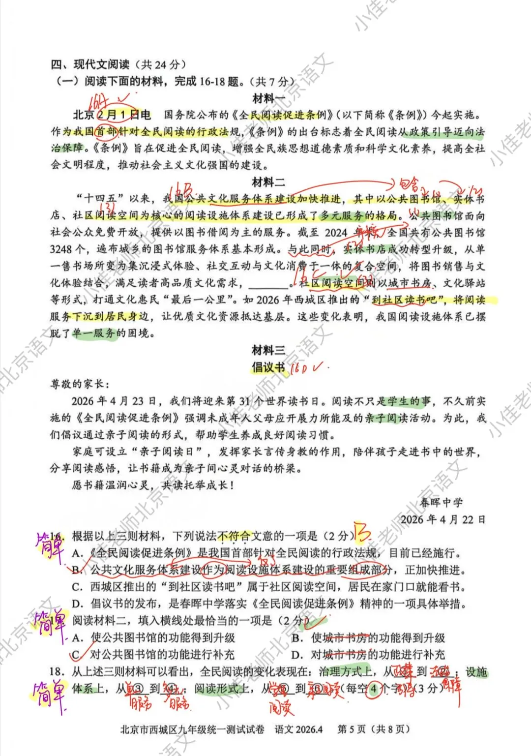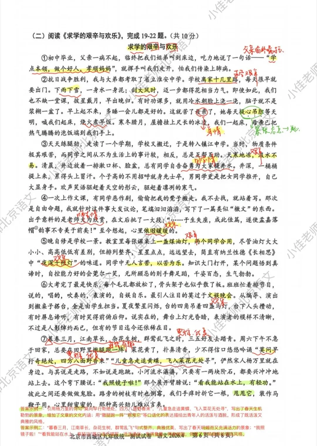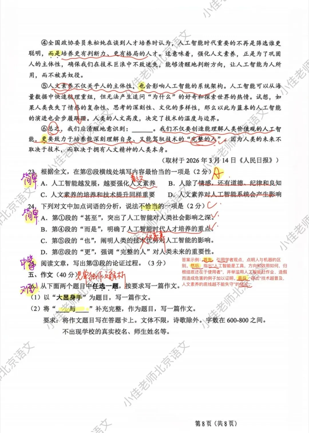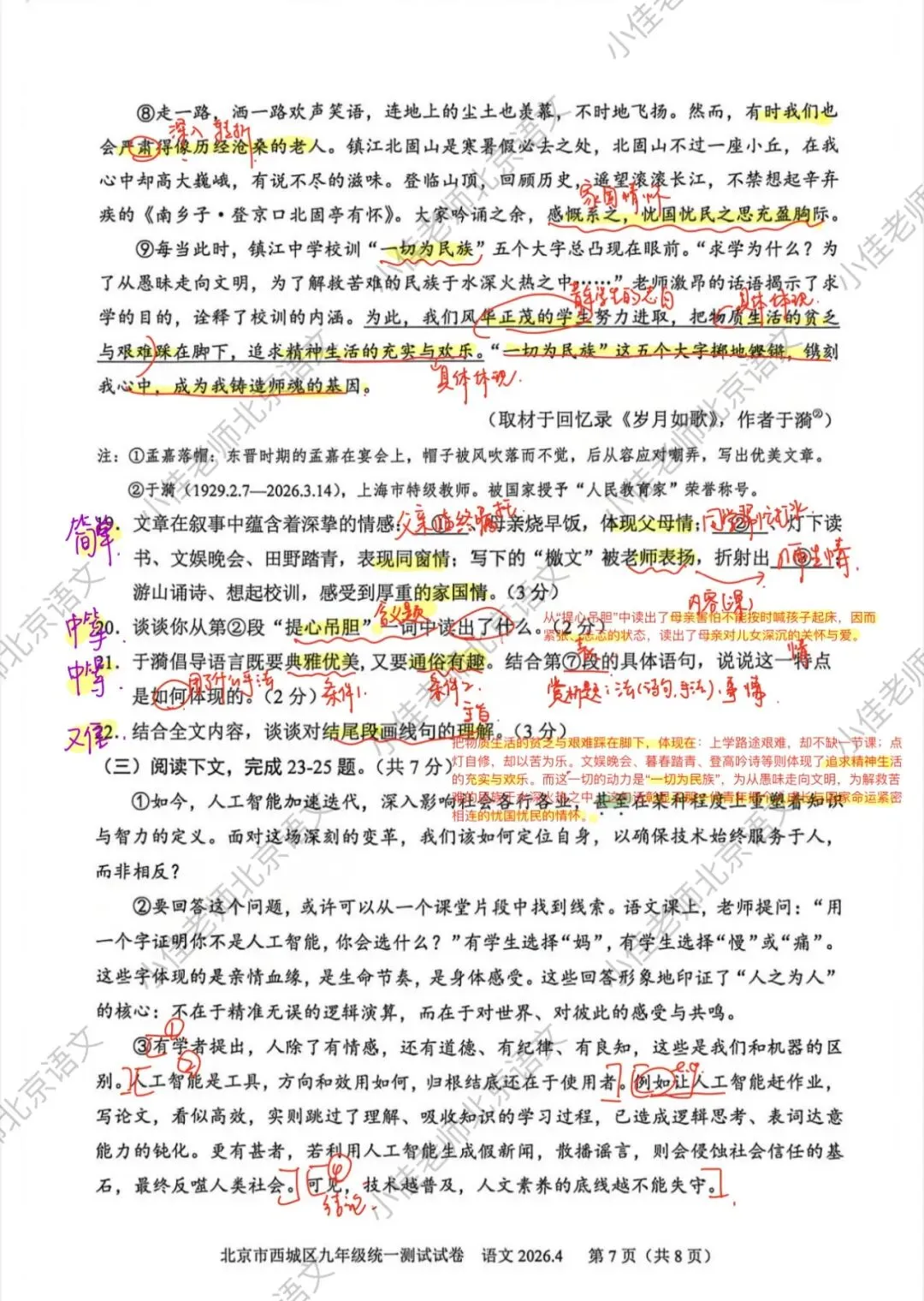 很好的一篇文章,前面三道题目中规中矩,都是过往中考真题考过的,最后一题也不难,但是要回答全就比较难,就看考生能不能回想起之前同类型题的做题思路以及精读文章。