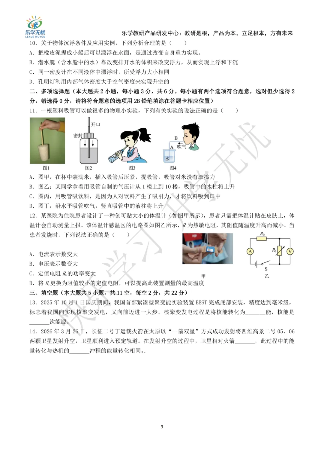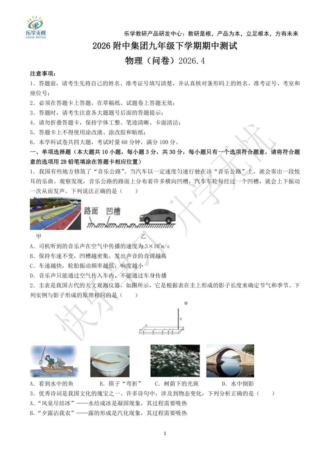 2025-2026-2附中集团九下期中考试物理试卷学生版.pdf