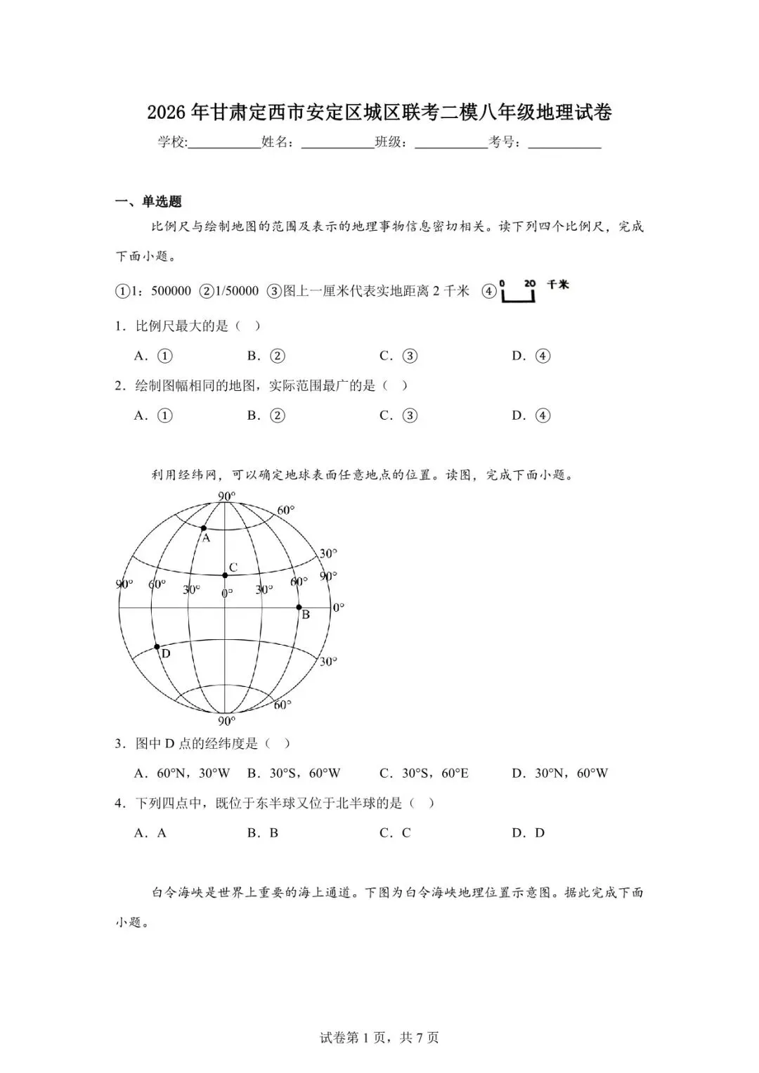 试卷:2025-2026学年度第二学期期中学业质量监测八年级数学(北师大版)