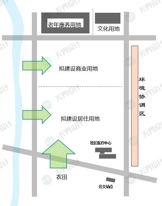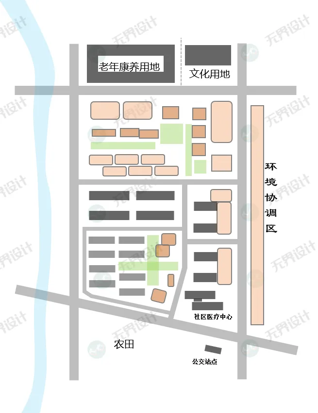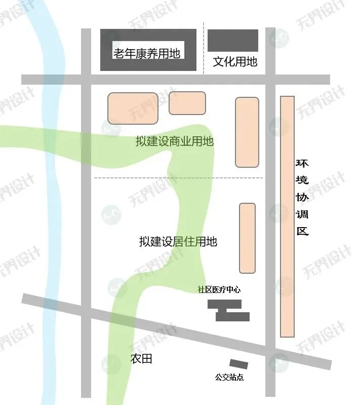 方案延续社区医疗和南北地块功能,提升居住街区东侧公共建筑占比,设置连贯型的居住街道界面。北侧打造商业商务功能混合的公共活力街区。