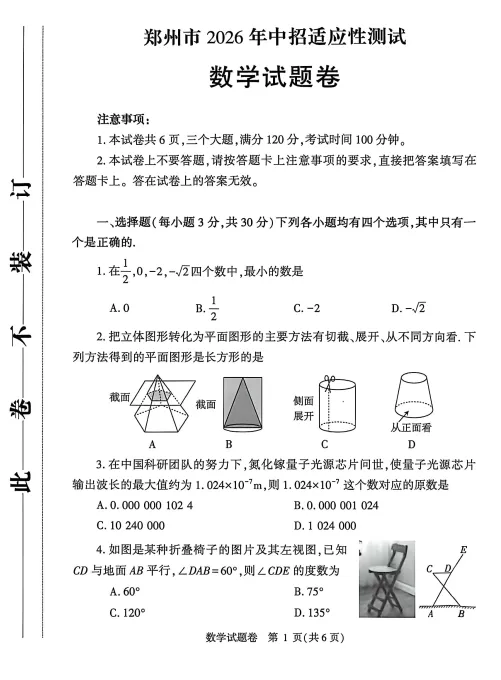 2026郑州初三模考七科试卷及答案(实时更新中)