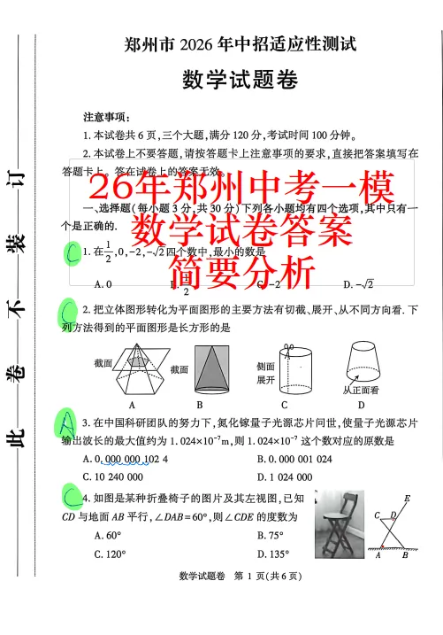 >2026年河南省郑州市九年级一模数学试卷&手写答案&简要分析