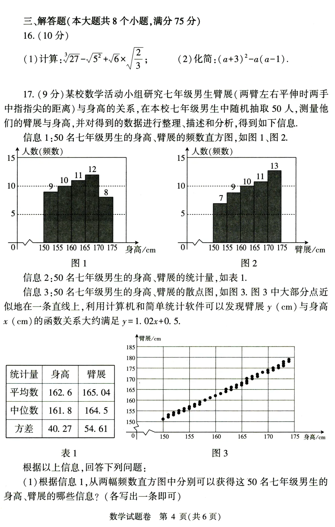 (1) 答案不唯一,例如:身高在160~170cm的人数最多;臂展在160~170cm的人数最多。(2) 臂展的平均数(165.04)和中位数(164.5)均大于身高(162.6和161.8),且臂展的方差(54.61)大于身高(40.27),说明臂展波动更大。(3) 符合。理由:臂展与身高的拟合关系为y=1.02x+0.5,斜率大于1,截距为正,表明臂展略大于身高;且散点图大部分在y=x直线上方。